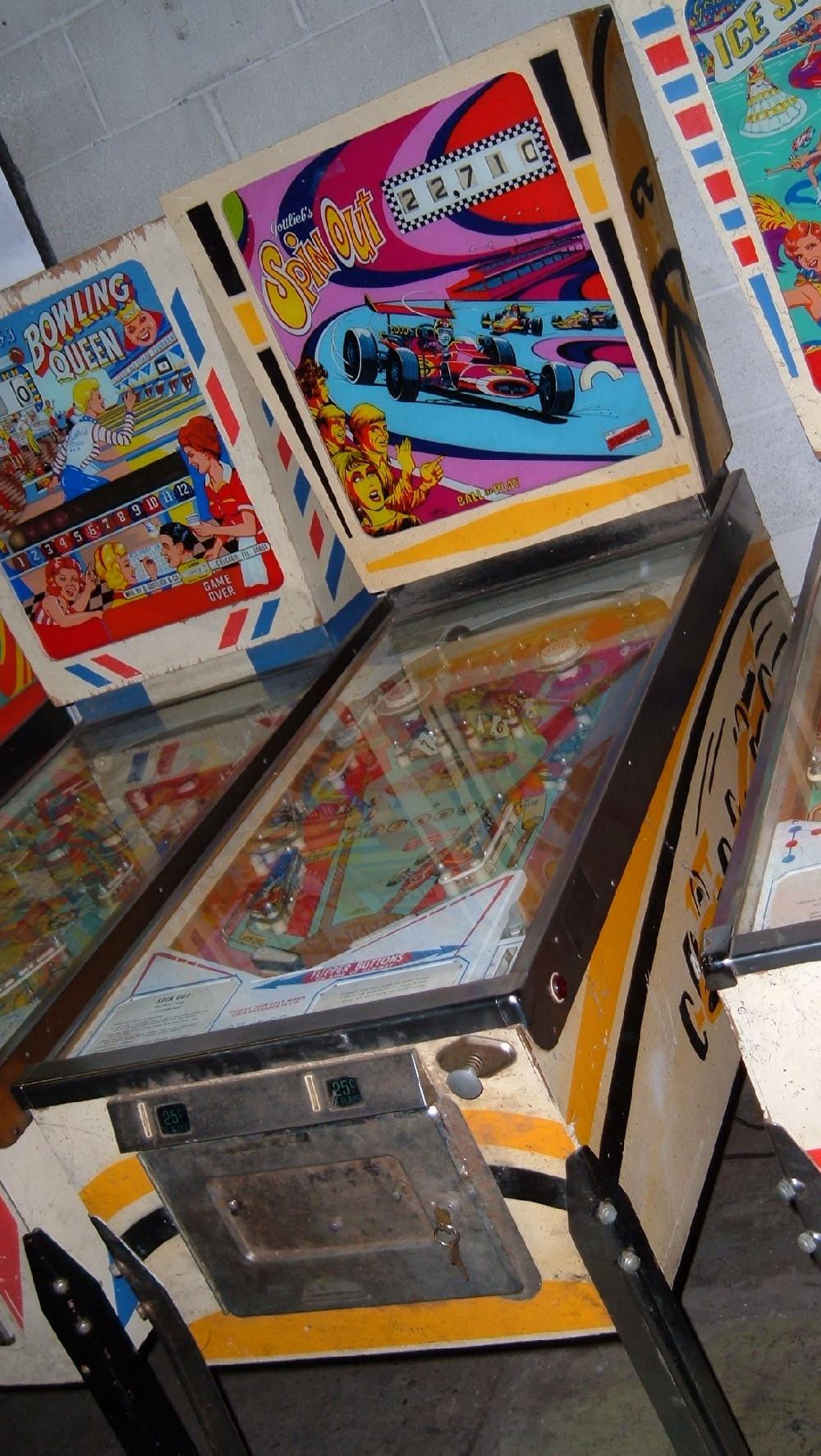 Description: Gottlieb Spin Out pinball. Two 3" fippers, two pop bumpers, two slingshots, a roto-target, and one kick-out hole. Hitting the numbered roto-target lights the correspondingly numbered insert on the playfield in front of the roto target. Each instance of four adjacent lit numbers awards one replay. The number '4' appears only once on the roto-target. This game has a "secret" multi-replay, giving five replays awarded "rat-a-tat-tat-tat." This is done if roto-target numbers '1' '2' '3' and '5' '6' '7' are hit, leaving only the number '4' unlit. Hit the number '4' last, and five replays are awarded. This was not documented on the flyer or on the score card. They made 2850 Gottlieb Spin Out pinballs. If you have a Gottlieb Spin Out for sale, please contact me at cfh@provide.net