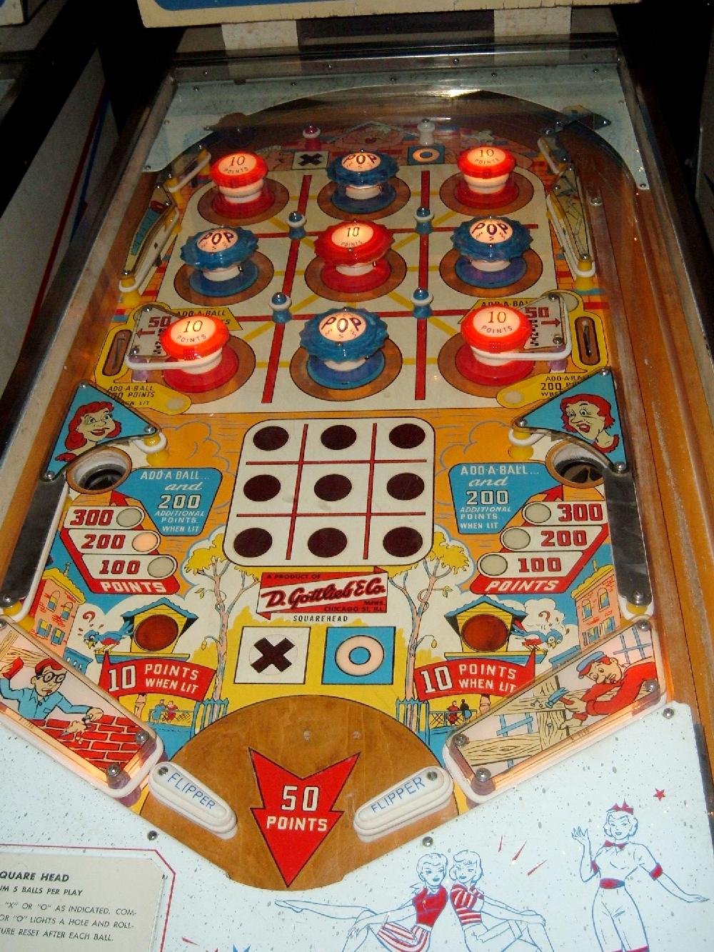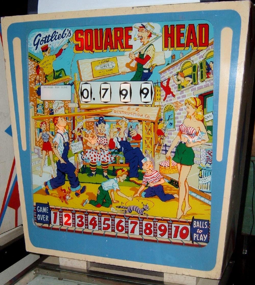 Description: Gottlieb Square Head, 6/63, 975 produced, 2 gobble holes, 9 bumpers (5 pop bumpers, 4 static bumpers). Add-a-ball version of Gottlieb Egg Head (12/61). If you have a Gottlieb Square Head pinball for sale, please contact me at cfh@provide.net.