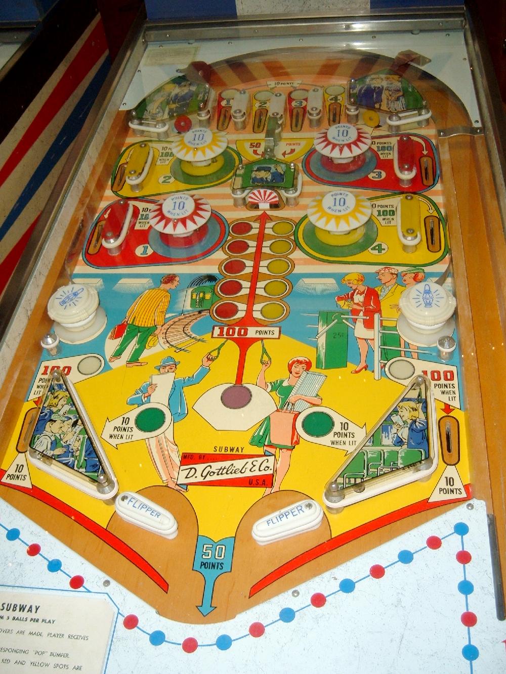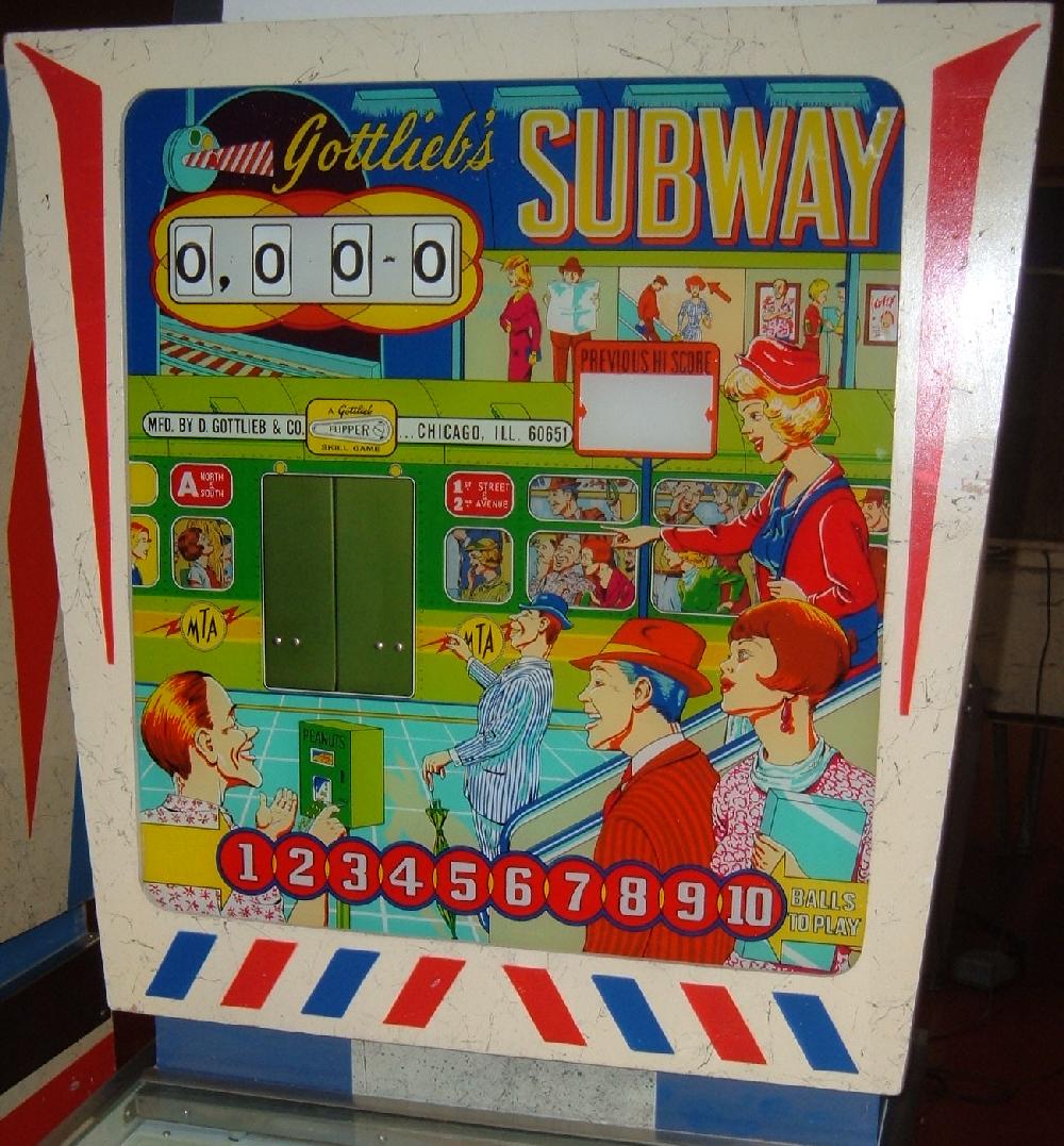 Description: Subway, 10/66, 3200 produced, Add-a-ball version of Crosstown (9/66), mechanical animation (subway doors in backbox), same playfield as Flipper Fair. Art Stenholm artwork. If you have a Gottlieb Subway pinball for sale, please contact me at cfh@provide.net