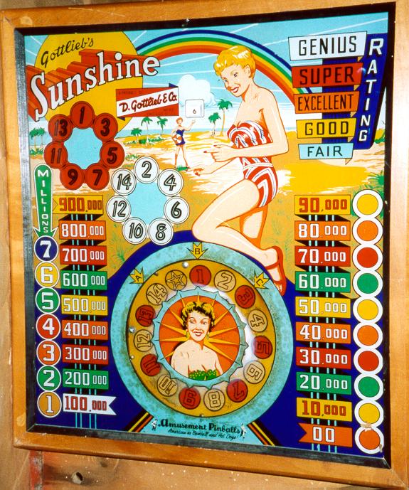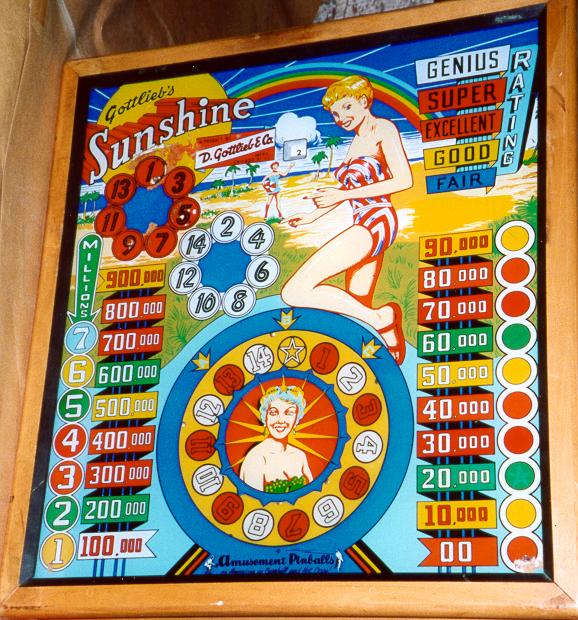 Description: Sunshine, 9/58, 1100 produced, 3 gobble holes, the first Gottlieb game with a "rating chart" (Genius!), "whirling numbers" rotating wheel animation in the backbox (much like the wheel in Hi-Diver 4/59). Two different paint color schemes used in the backglass. Roy Parker playfield and backglass woodrail pinball artwork. Please contact me at cfh@provide.net if you have this game for sale.