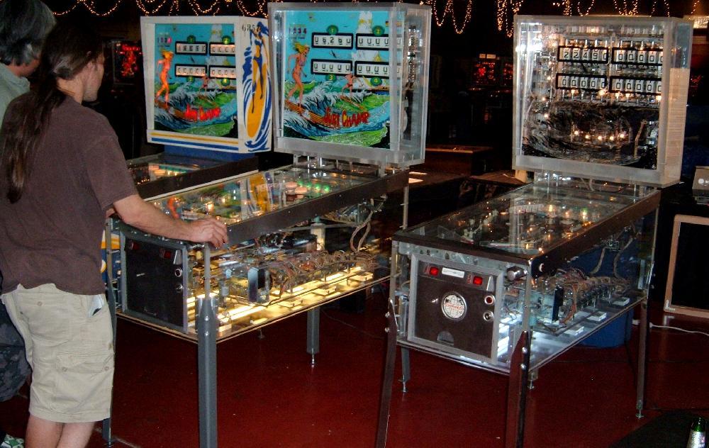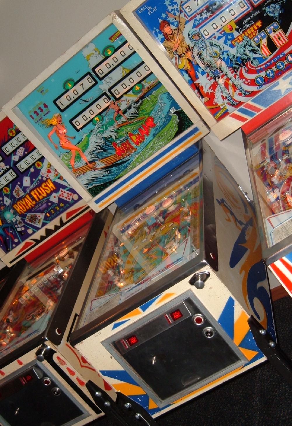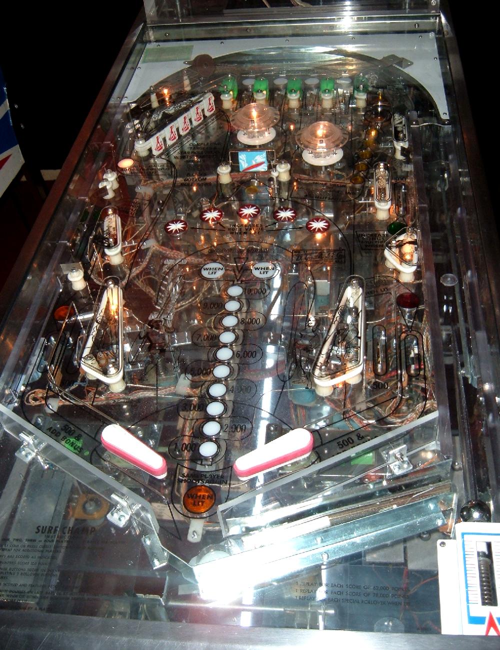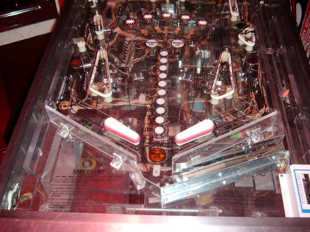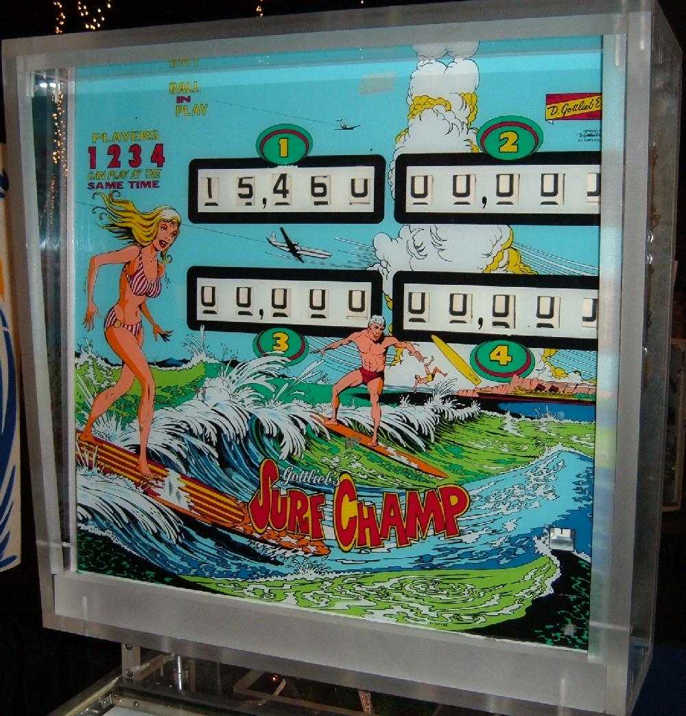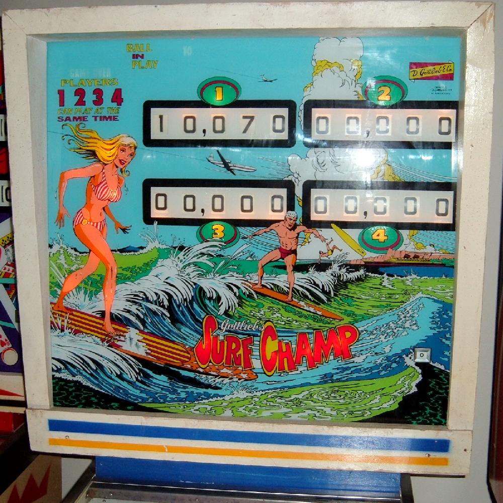 Description: Gottlieb Surf Champ pinball. Same game as Gottlieb Surfer pinball, just different number of players (4 players versus 2 players). Gottlieb sold this game design in the two flavors, though they are essentially the exact same game (with slight artwork differences). The 2 player version (Surfer) had a lower price than the 4 player (Surf Champ), and was marketed to game operators with less money to spend. Two pop bumpers, 5 drop targets, star rollovers, two slingshots, one spinner, one kickout hole, two 3" flippers. Has Bonus, Double Bonus, Triple Bonus and Specials. They made 7075 Gottlieb Surf Champ pinballs (often seen as 1075, but that's a typo that has propagated through the internet), and 2700 Gottlieb Surfer pinball machines. If you have a Gottlieb Surf Champ pinball for sale, please contact me at cfh@provide.net