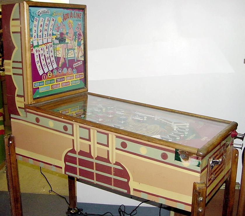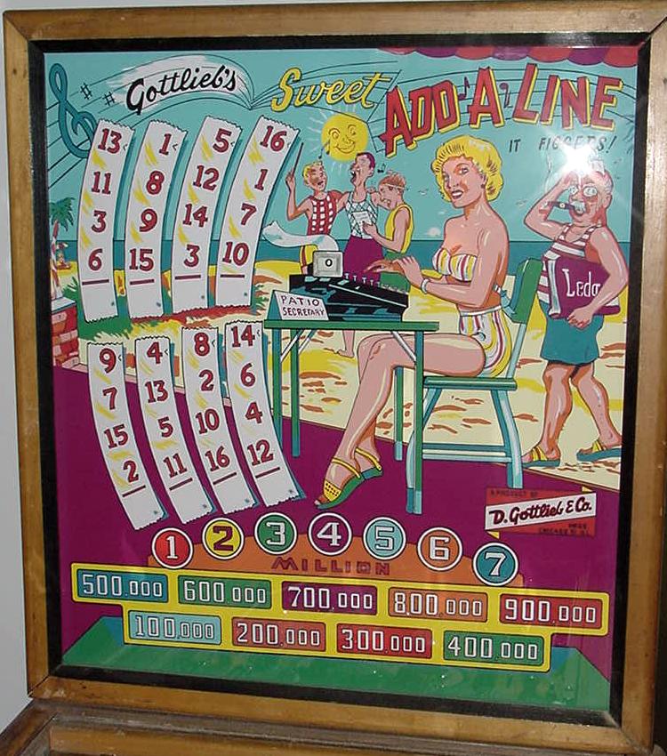 Description: Sweet Add-A-Line, Gottlieb, 7/55, 800 produced, 2 gobble holes, "balls played" ball arch lights, a rollovers style game. Replays won by high score, or by unlighting the rollovers. If you can unlight all the rollovers, player wins 26 credits as soon as the last rollover is unlit (assuming the credit unit is currently at the zero position). Sweet AddaLine does this by turning the score motor and continually adding games to the credit unit until the max-credit switch opens at 26 credits (Gottlieb credit units only go to 26 credits). The lower gobble hole can also score multiple credits (one credit for each lit arrow, up to 8). The Special arrows start to light for the lower gobble hole after 10 or 11 of the 16 rollovers are unlit. Woodrail pinball with artwork by Roy Parker. The mate to Gypsy Queen (though not exactly the same, they are quite similar). Please contact me if you have a Gottlieb Sweet Add-a-line woodrail pinball for sale at cfh@provide.net