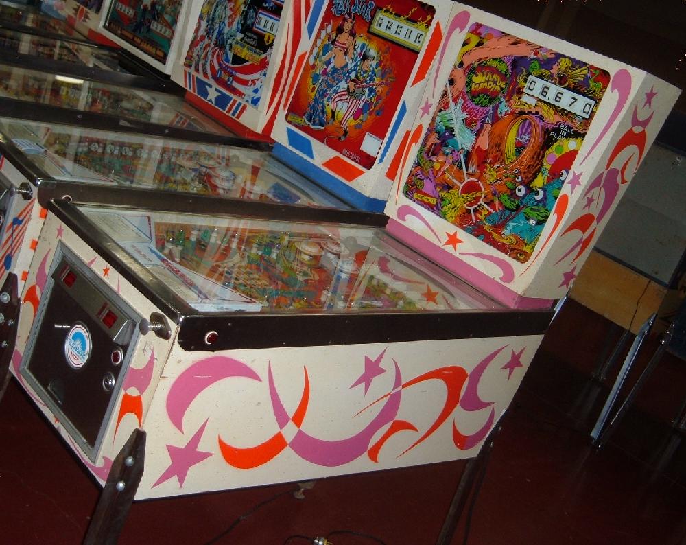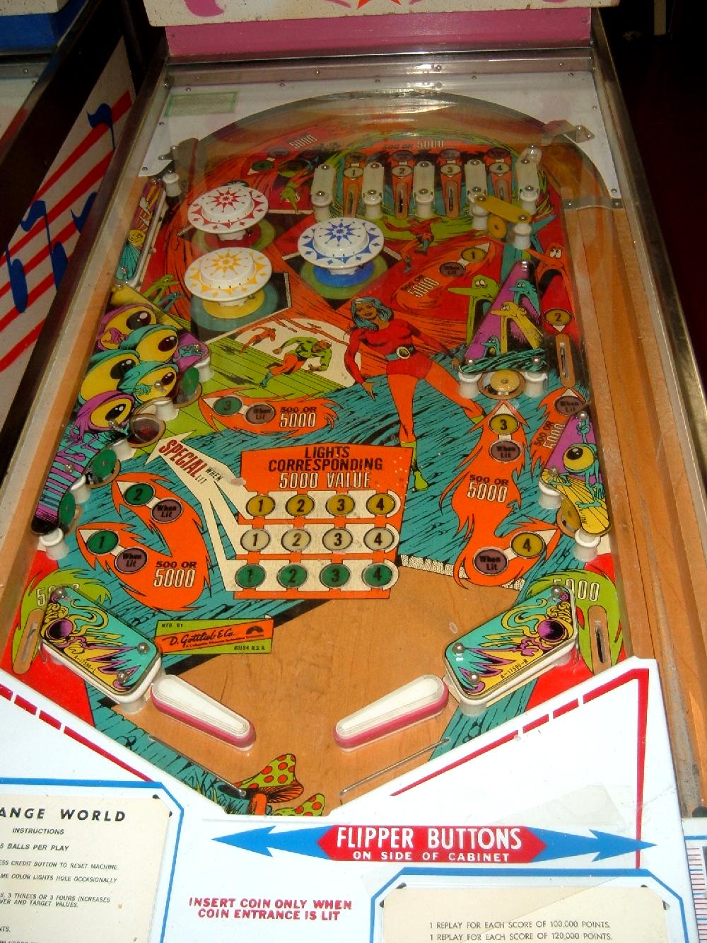 Description: Gottlieb Strange World pinball. Very interesting artwork. They made 675 Gottlieb Strange World pinballs in the replay version. If you have a Gottlieb Strange World pinball for sale, please contact me at cfh@provide.net