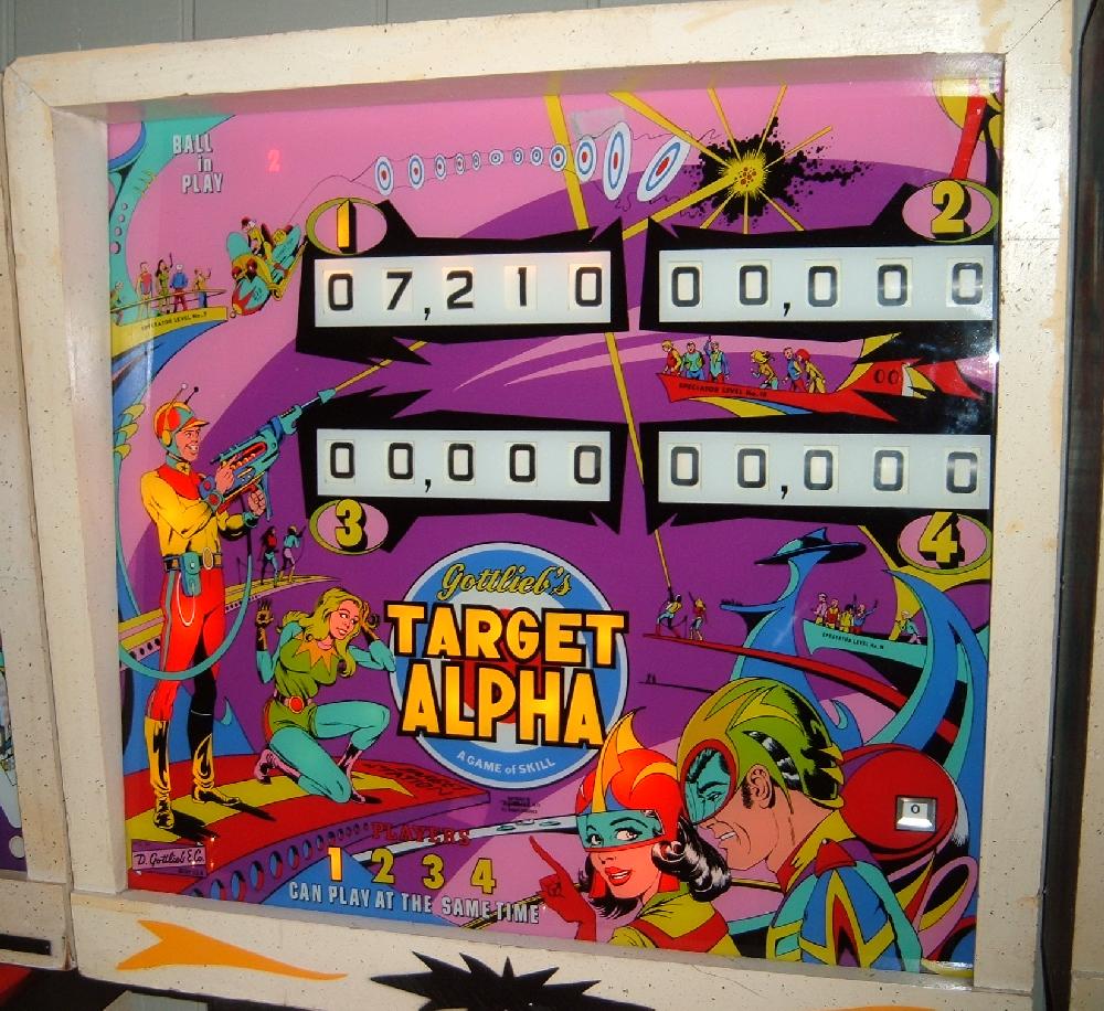 Description: Gottlieb Target Alpha pinball. Same game as Gottlieb Solar City, just different number of players (4 players versus 2 players). Gottlieb sold this game design in the two flavors, though they are essentially the exact same game (with major artwork and theme differences). The 2 player version (Solar City) had a lower price than the 4 player (Target Alpha), and was marketed to game operators with less money to spend. A very cool gottlieb pinball design with a bank of 10 drop targets across the top, and another 5 on the right side. The drop targets have red bullseyes printed on them. Four flippers, two 3" flippers at the bottom and two 2" flipper at the top of the playfield. Two pop bumpers and two slingshots, several rollover lanes. The longest shot in pinball from the lower left flipper to the upper right drop target. They also made this game in a single player format called Gottlieb Eldorado and Gottlieb Gold Strike, and an export game called Gottlieb Canada Dry. Gottlieb used this playfield design several times, so it was a popular design. They made 7285 Gottlieb Target Alpha pinballs, and 2525 Gottlieb Solar City pinball machines. If you have a Gottlieb Target Alpha or Gottlieb Solar City pinball for sale, please contact me at cfh@provide.net