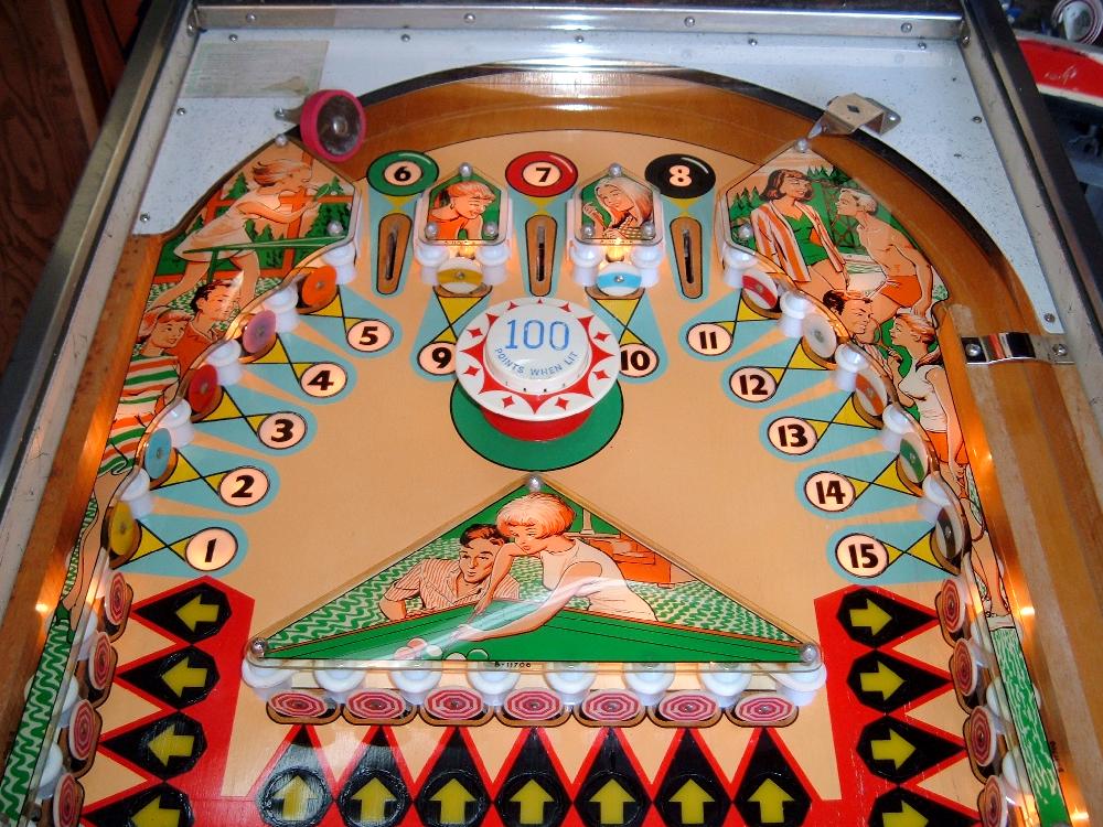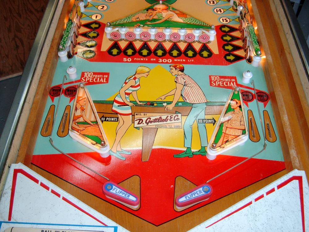 Description: Gottlieb Target Pool pinball. Same game, with minor artwork difference as Mini Pool (add-a-ball, Target Pool is replay). One pop bumpers, 27 standup targets (!), 7 rollovers, four slingshots, two 2" flippers. If you ever wanted a game with lots of standup targets, there is no match to Gottlieb Mini-Pool and Target Pool. They made 2425 Gottlieb Target Pool pinballs, and 500 Gottlieb Mini Pool add-a-ball pinball machines. If you have a Gottlieb Target Pool pinball for sale, please contact me at cfh@provide.net
