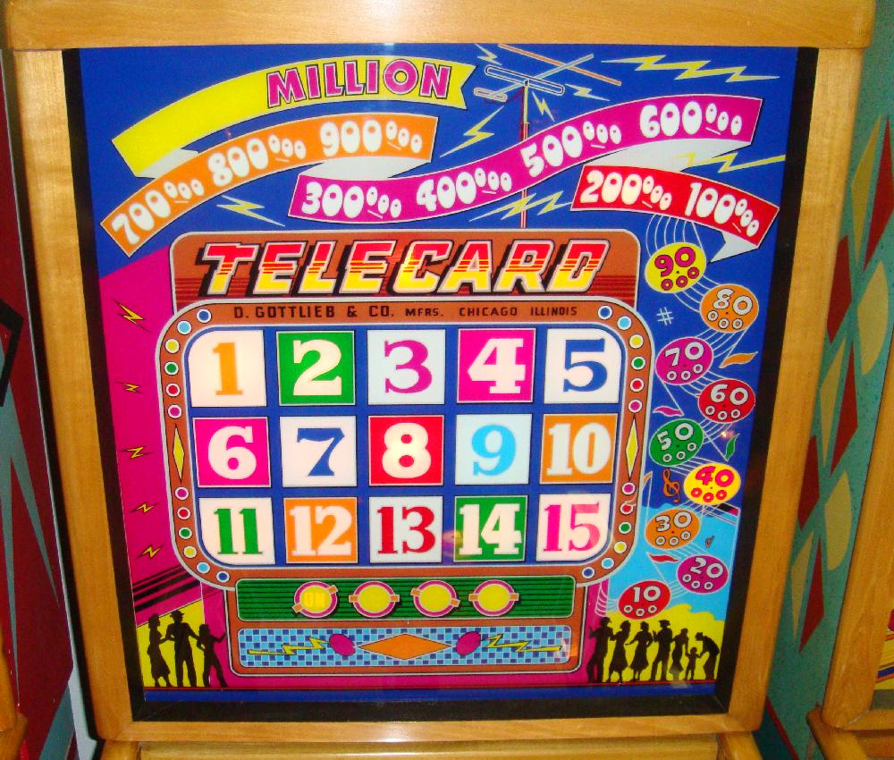 Description: Telecard, 1/49, three kickout holes, 1700 produced. Same playfield as Gin Rummy (2/49). Roy Parker playfield and backglass woodrail pinball artwork. Please contact me at cfh@provide.net if you have this game for sale. If you have a Gottlieb Telecard pinball machine for sale please contact me at cfh@provide.net