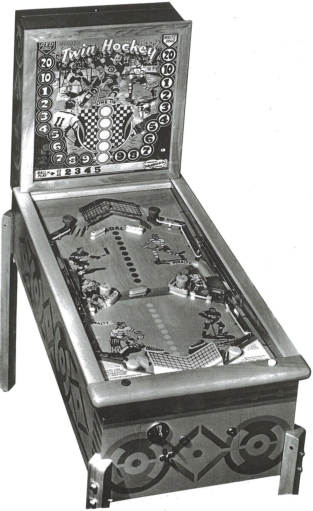 Description: Twin Hockey, 1952, Gottlieb, just a few produced, nine flippers, a two player arcade game in a pinball cabinet. Pretty interesting design, players stand beside each other and have a single flipper button. Center ninth flipper is motorized and constantly spins to move ball around. Playfield is concaved with the center being the lowest point. Each player has four flippers that they control. The first multi-player "pinball", if you can call it a pinball. Roy Parker backglass and playfield art, woodrail pinball. If you have a Gottlieb Twin Hockey arcade pinball for sale please contact me at cfh@provide.net if you have this game for sale.