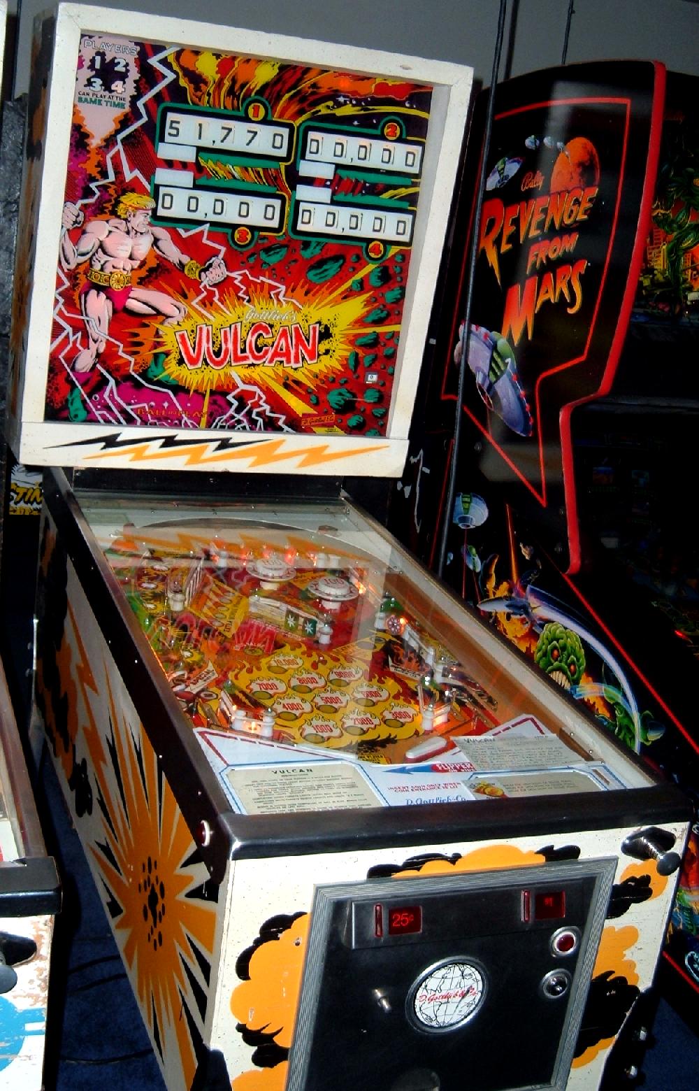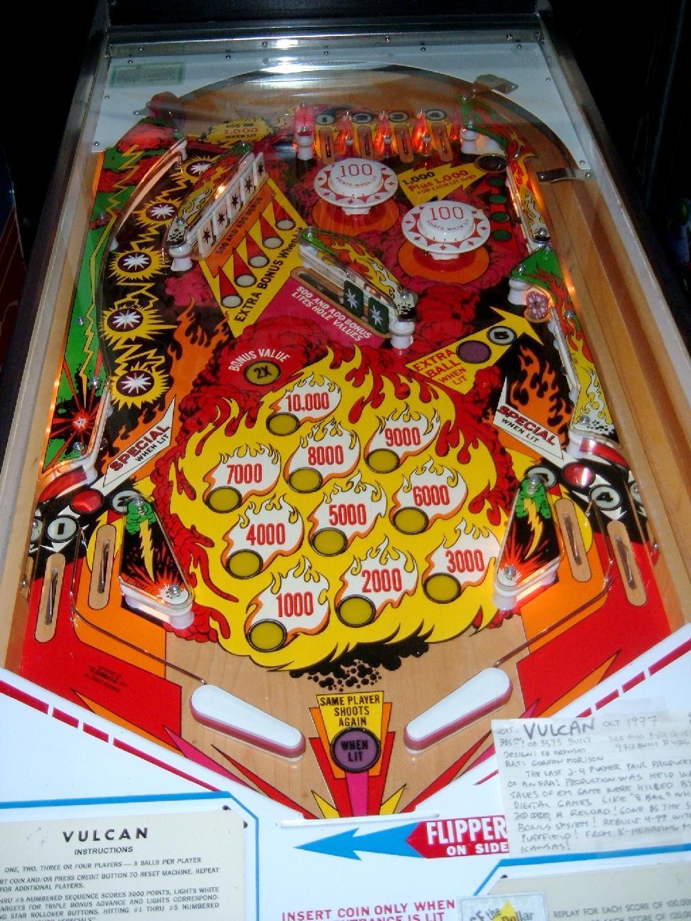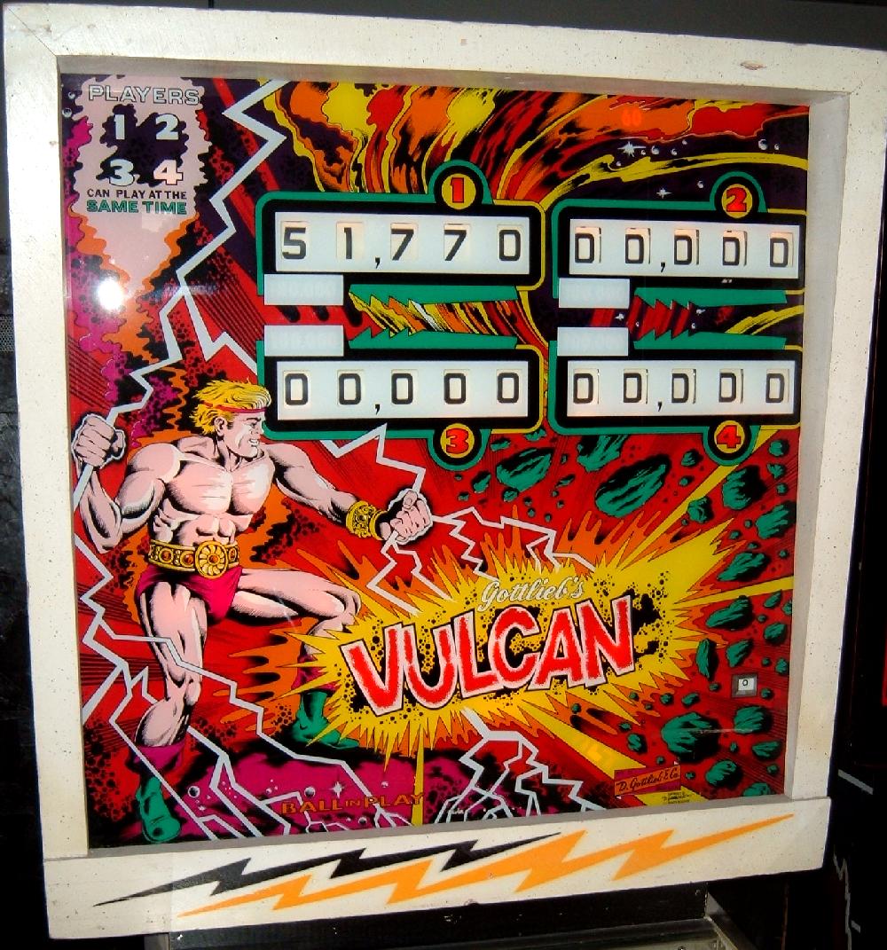 Description: Gottlieb Vulcan pinball, which is the 4 player version of Gottlieb Fire Queen pinball. Same game, just different number of players (4 players versus 2 players). Gottlieb sold this game design in the two flavors, though they are essentially the exact same game (with artwork differences). The 2 player version (Fire Queen) had a lower price than the 4 player (Vulcan), and was marketed to game operators with less money to spend. Two banks of drop targets, one with 5 white targets the other with 4 green targets. Two pop bumpers, two slingshots, two 3" flippers, one kickout hole. Completing the five numbered targets lights the side lanes for special. Also each numbered target has a corresponding left side rollover that changes from 100 to 1000 points. If all white drop targets are downed, bonus 2x is activated, and the white drop targets reset. If the player gets all the green drop targets down, the number "5" standup target on the right lights for extra ball (same player shoots again), and the green drop targets stay down (allowing only one extra ball per ball in play.) Once the player gets the extra ball and drains, all targets reset except for the 1 to 5 numbered targets which do no change. Note the "5" target is adjustable to make it harder or easier to hit for the extra ball. An interesting pinball playfield design. I like the two player Fire Queen pinball artwork better than Vulcan personally. They made 3575 Gottlieb Vulcan pinballs, and 970 Gottlieb Fire Queen pinball machines. If you have a Gottlieb Vulcan pinball for sale, please contact me at cfh@provide.net