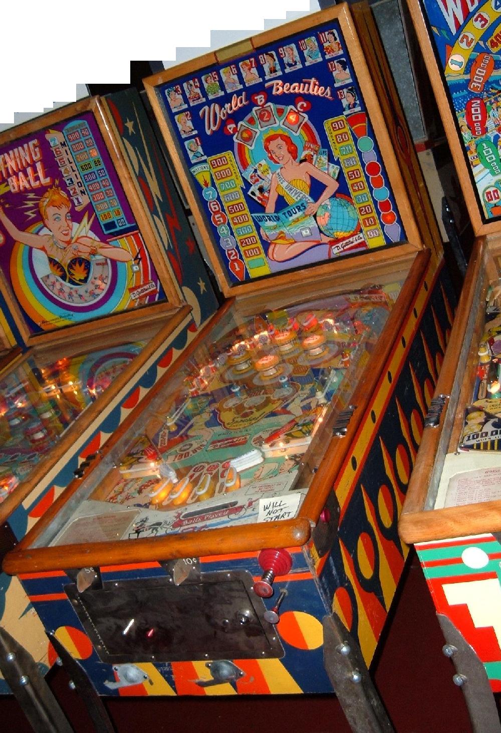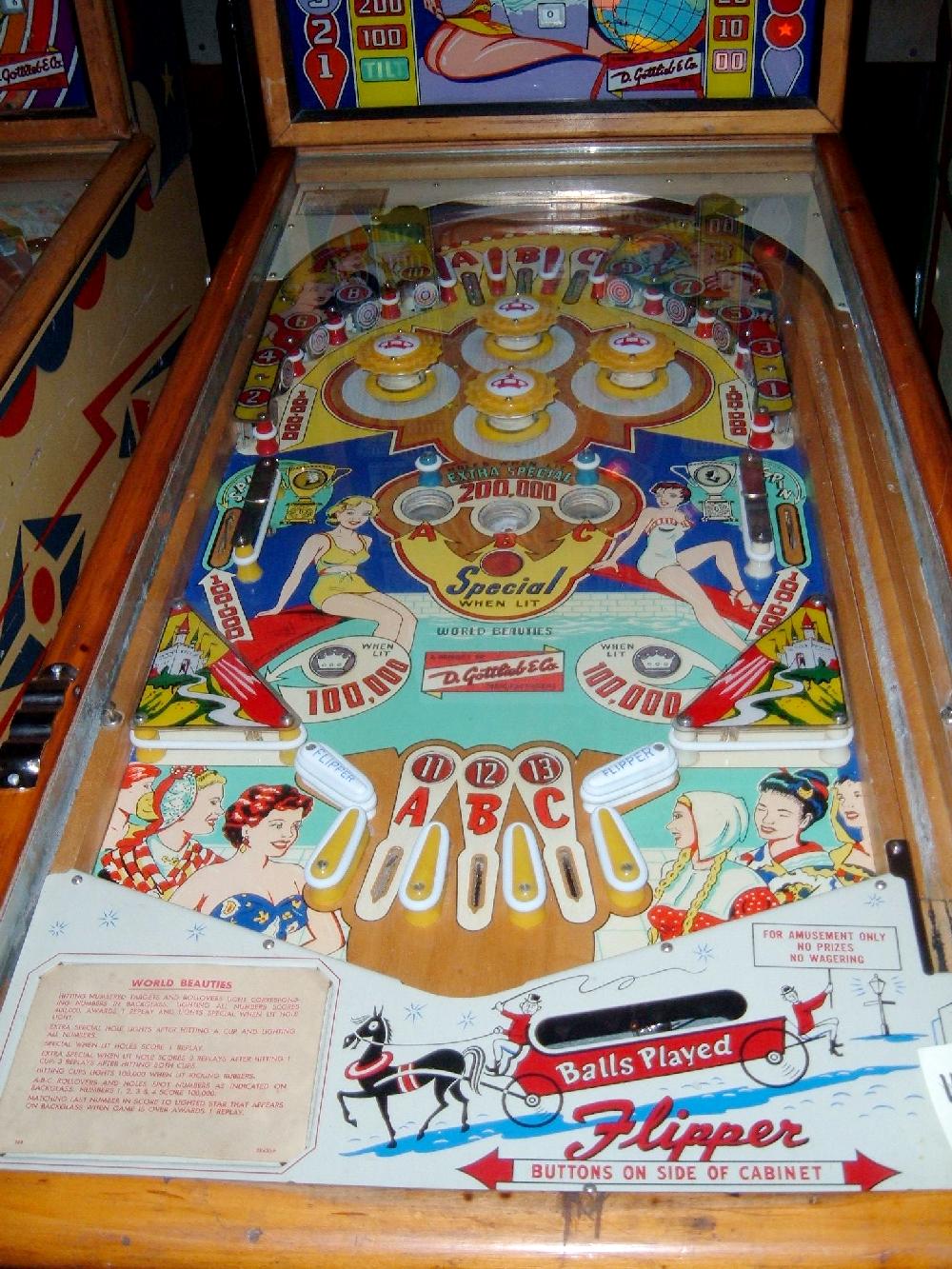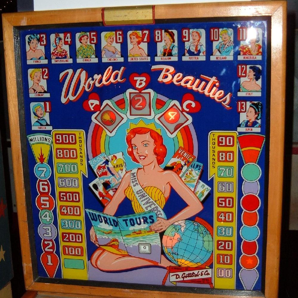 Description: World Beauties, 2/60, 900 produced, 1 player with light bulb scoring, backbox mechanical animation (roto-target in backbox), 3 gobble holes, light bulb scoring, nearly identical to Queen of Diamonds (6/59). Roy Parker playfield and backglass woodrail pinball artwork. Please contact me if you have a Gottlieb World Beauty for sale at cfh@provide.net