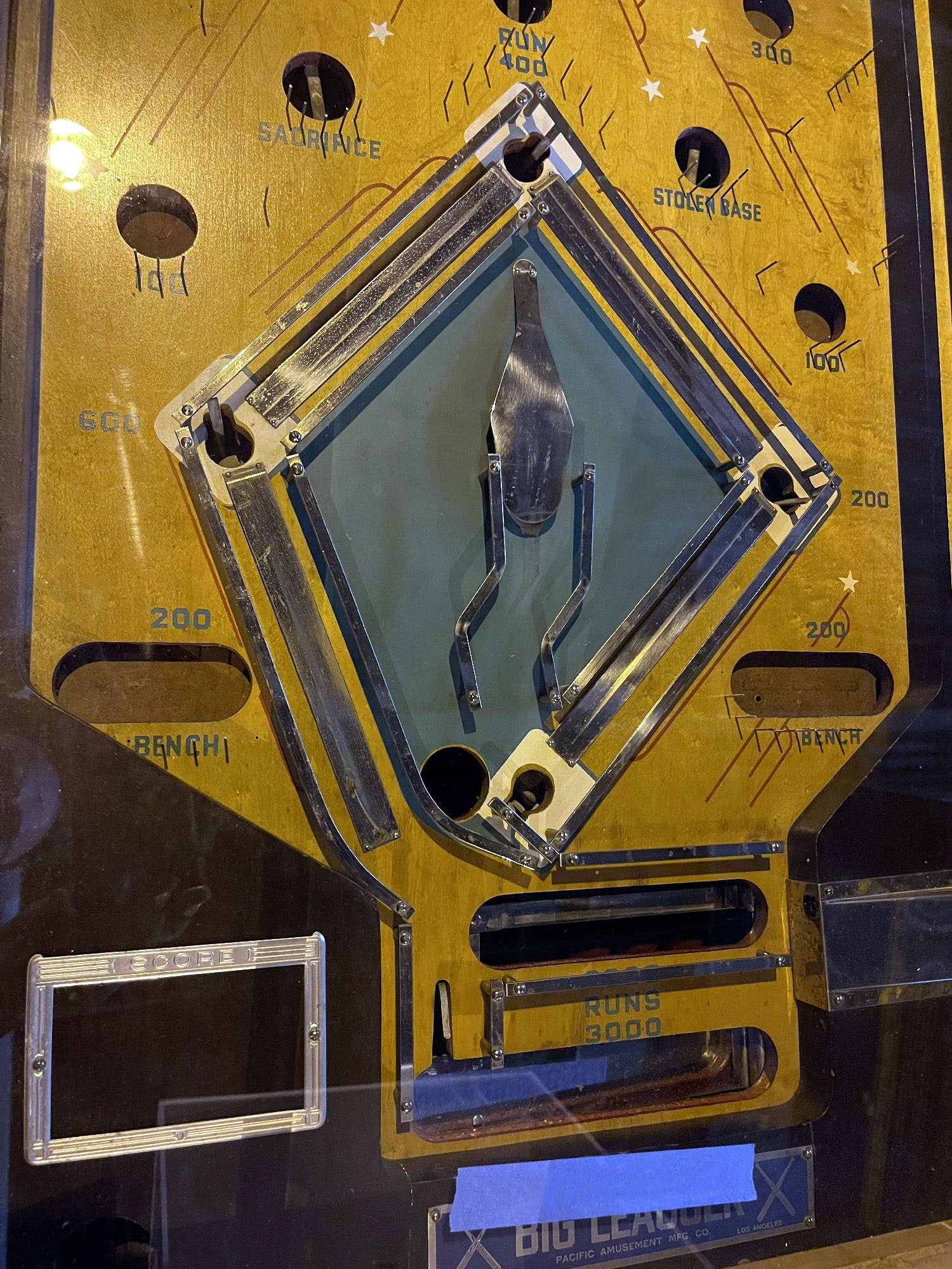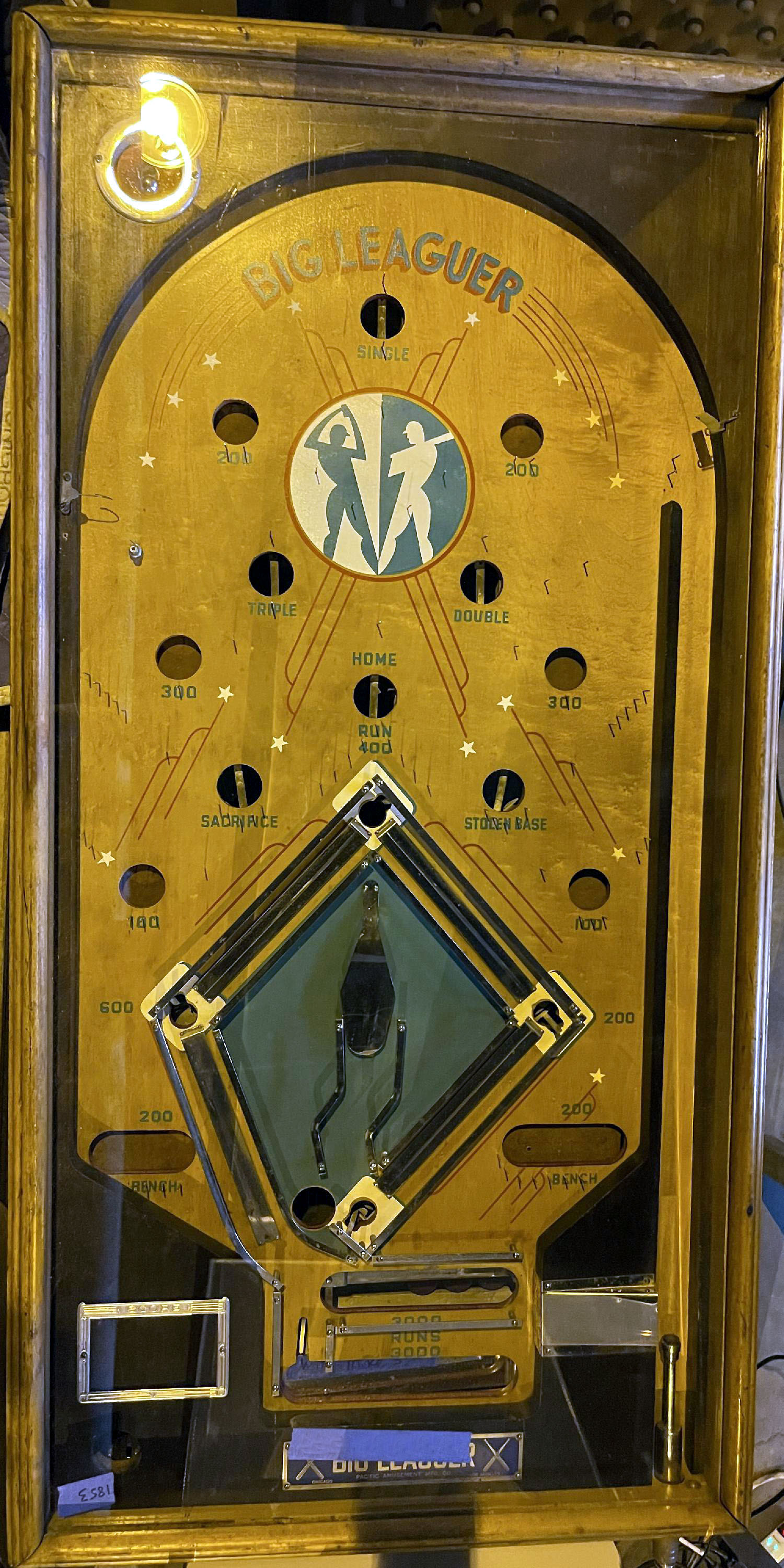 Description: Big Leaguer, Pacific Amusement Co. (PamCo), 06/35, baseball pinball with mechanical playfield animation, one model available with hidden payout mech. Electro mechanical pinball. Please contact me if you have this game for sale at cfh@provide.net