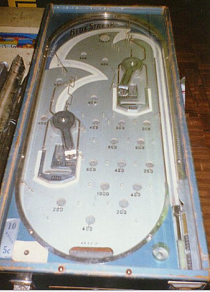 Description: Blue Streak, Daval Mfg Company, 10/34, uses two mechanical ball diverters on the playfield. Mechanical pinball (no electricity). Please contact me if you have this game for sale at cfh@provide.net