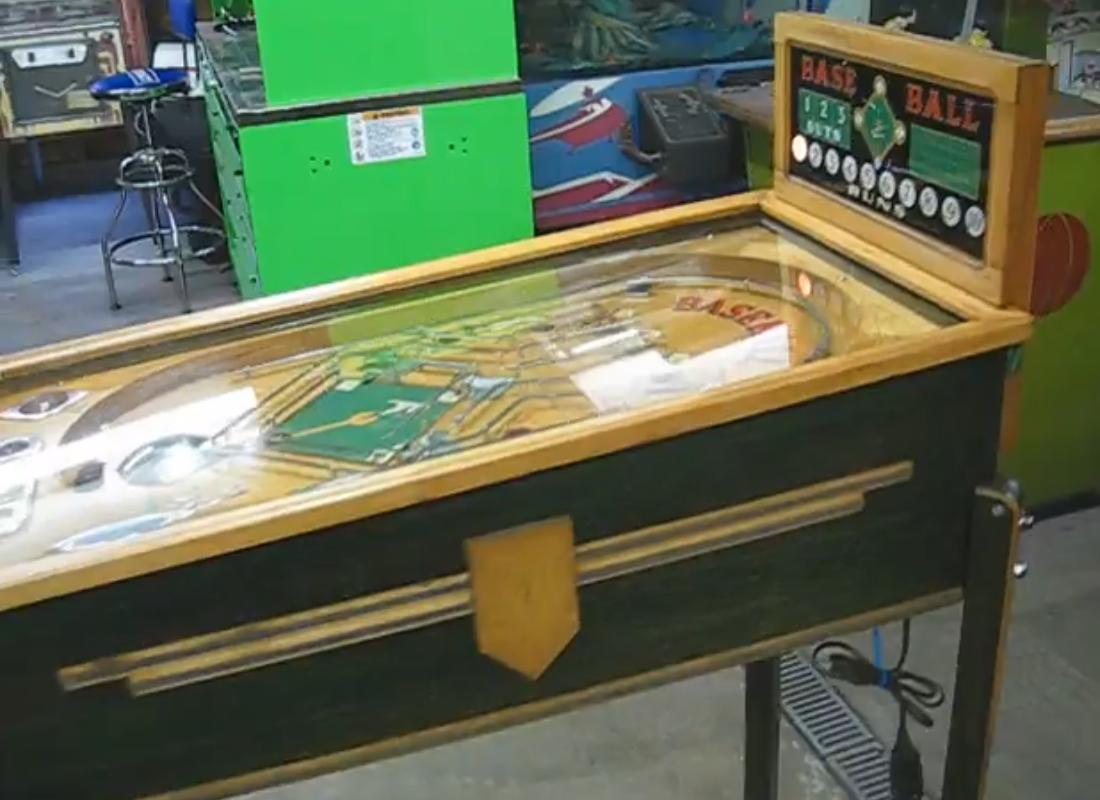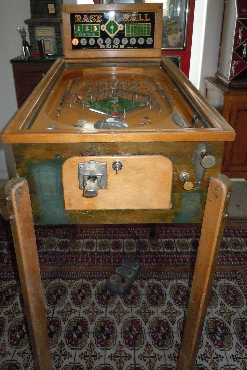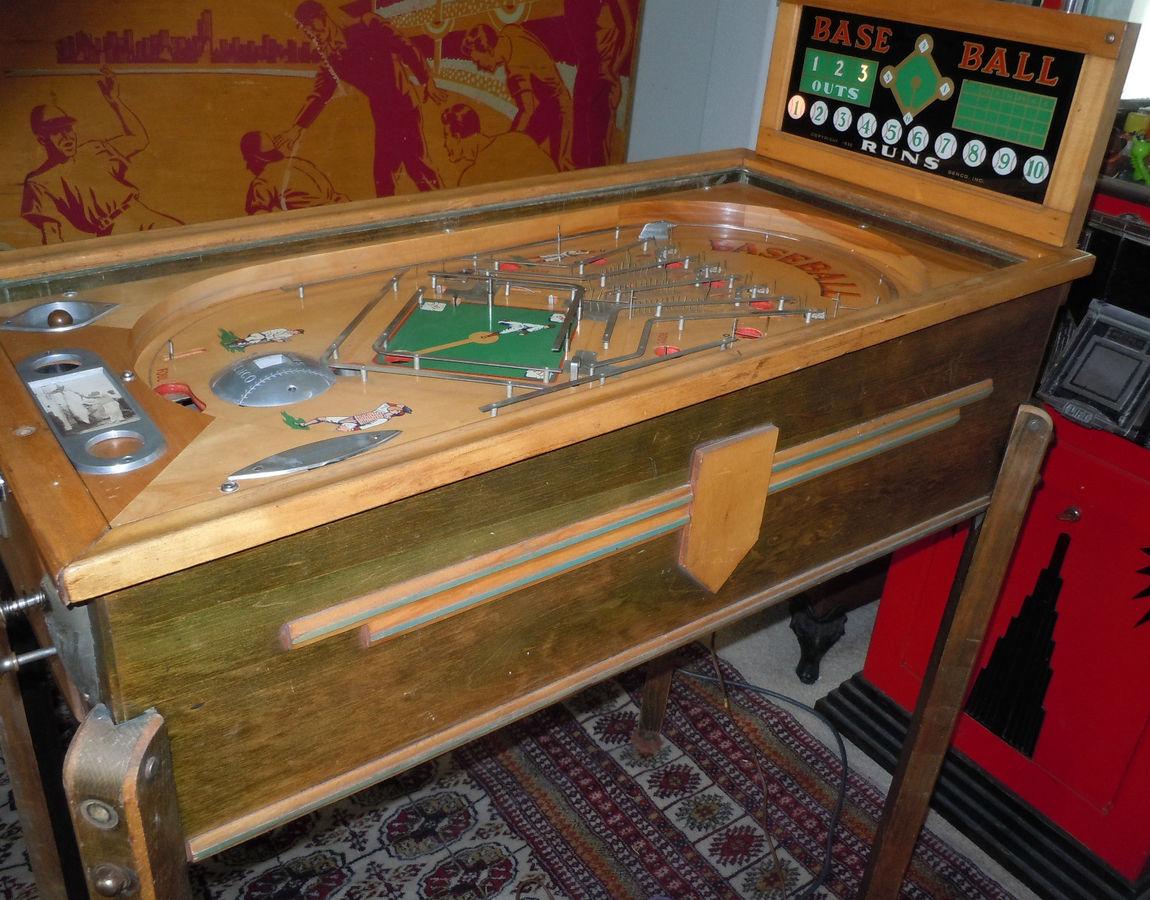 Description: Base Ball, Genco, 06/35, mechanical baseball game. The backglass shows runs, outs, and players on base, and the runs are also recorded on lower playfield. Getting three outs ends the game (one inning per game.) Operates on a dry cell battery. Electro mechanical pinball. Please contact me if you have this game for sale at cfh@provide.net