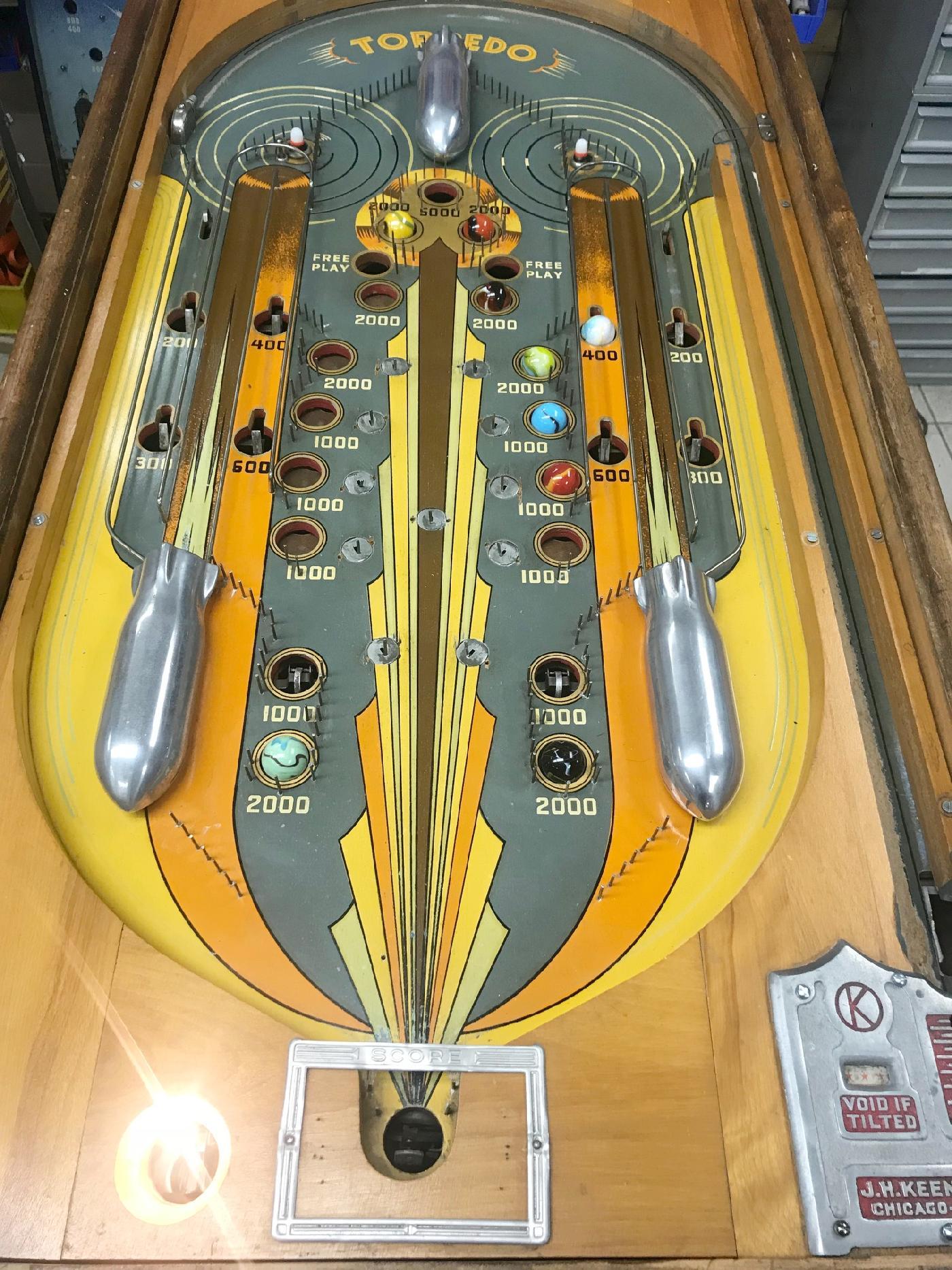 Description: Torpedo, Keeney, 02/36, war based machine with electrical lights and kickers. Electro mechanical pinball. This Keeney Torpedo pinball was basically a copy of the Rube Gross & Co. Torpedo. Please contact me if you have this game for sale at cfh@provide.net