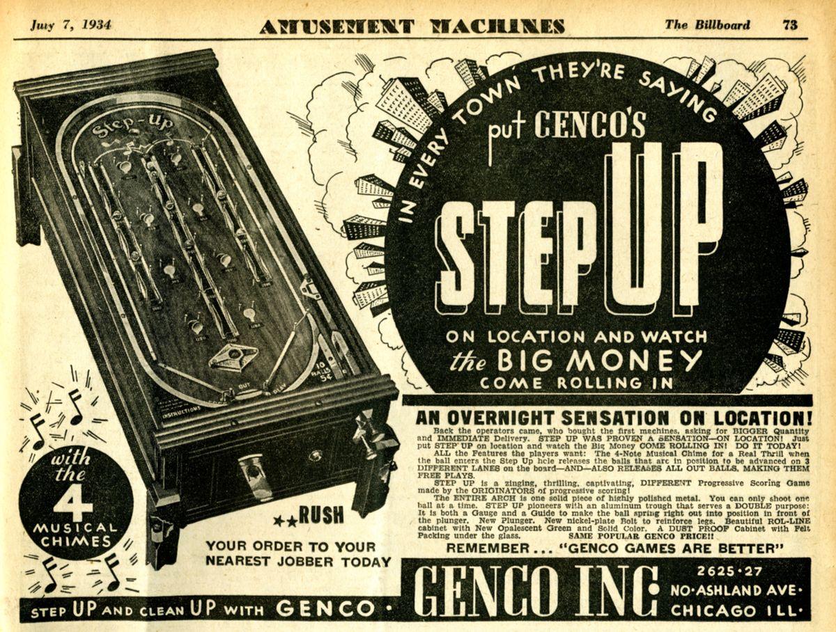 Description: StepUp, Genco, 06/34, balls landing in top Step Up hole plays a 4-note musical chime, advances playfield balls along the three wire form tracks, and releases all of the outhole balls to be played again. Player can shoot only one ball at a time into play. The chime sounds happen by balls hitting internal bells and the ball advancement is generated by the weight of balls on the trips. No electrical power is used in this game. Mechanical pinball. Please contact me if you have this game for sale at cfh@provide.net