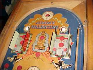 Description: Jimmy Valentine, Scientific Machine Corporation, 01/36. Get the balls in the holes above the tin "safe" doors, and then drop one in the center hole above those and the safe doors pop open. (You can get higher scores from the holes in the safe.) This game is named after a master burglar and safecracker from the 1909 short story "Alias Jimmy Valentine." Electro mechanical pinball (batteries.) Please contact me if you have this game for sale at cfh@provide.net