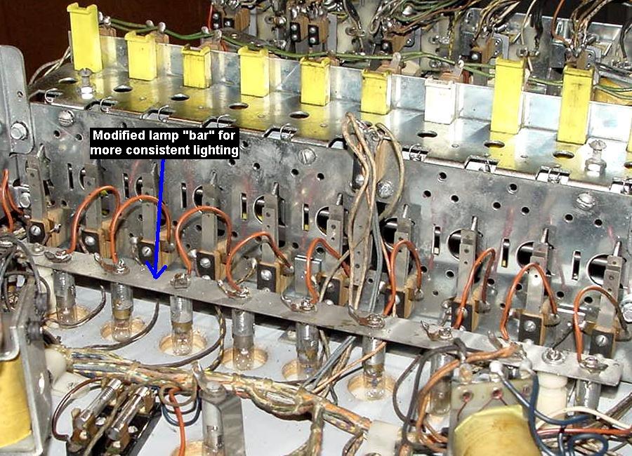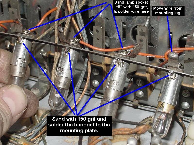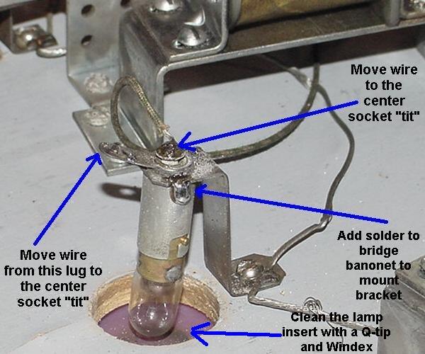 Here's a stand-alone socket that has had the similar modification for more lighting dependability. While you're doing this stuff, it's not a bad idea to use a Q-tip and some Windex to clean the underside of the lamp inserts. |