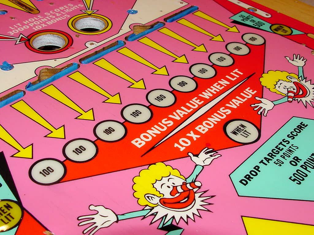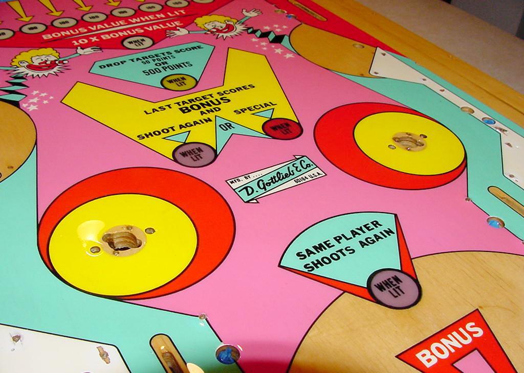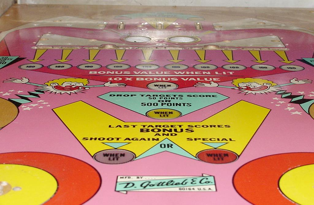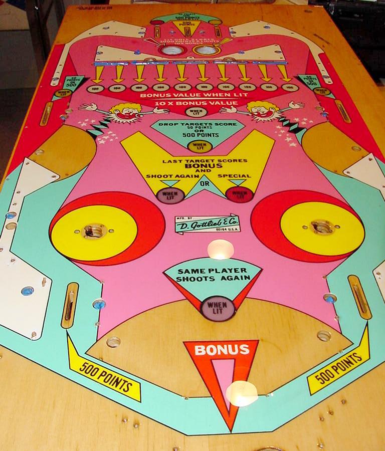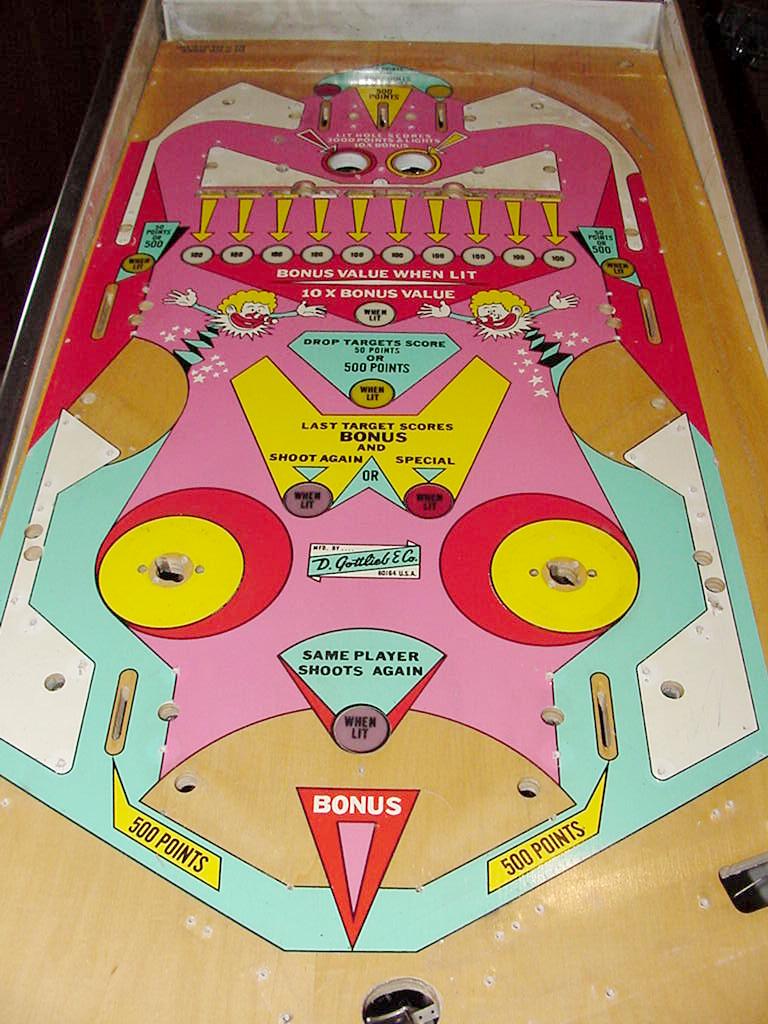 The reason this game is hard to find in decent condition is due to its popularity. It's a great playing game with a bank of 10 drop targets and the ability to earn an extra ball ("same player shoots again") and/or a free game ("special"). Not a lot of EM Gottlieb multiplayers from the 1970s have the extra ball feature. Also the backglass artwork is considered one of the best from the 1970s. So in the day this game got played a lot, making finding one today more difficult. I'm really not a big fan of multiplayer EM games, but the Gottlieb Jumping Jack (2 player) and Jack in the Box (4 player) are exceptions. There are a handful of 1970s Gottlieb multiplayer games that are good, and these fall into that category. I also have a single player Gottlieb King Pin, which is very similar is playfield layout to Jumpin Jack, but not exactly the same. I like King Pin better in many regards, but the backglass artwork on Jumpin Jack/Jack in the Box is hard to resist.