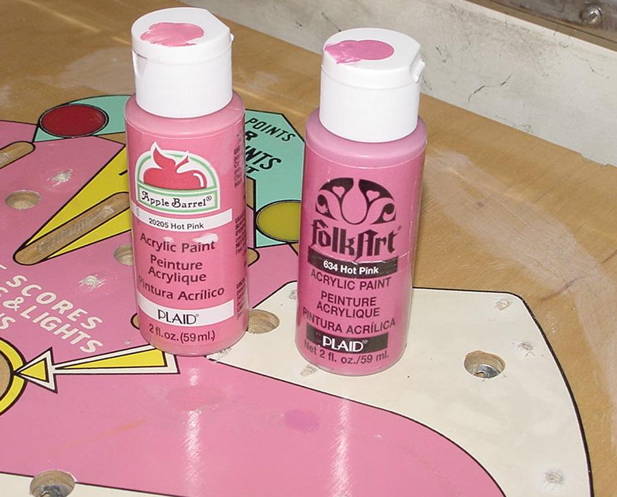 Here's the touchup paints I will be using for the pinks. They are acrylic water-based at paints, available at Meijer or Frank's or Micheal's. My buddy Cliffy's choice for color match of the pink did not turn out to be the best on my game. Maybe his pinks were different on his Jumpin Jack, I'm not sure. Here's a sample. Cliffy's color is on the right. The one I'm using is on the left. Though I'm not a huge fan of either Folkart or Apple Barrel acrylics (they seem to have less color pigment than say Americana brand acyrlics), the Apple Barrel Hot Pink #20205 does seem to match well. So that's what I will be using in the pink areas. |