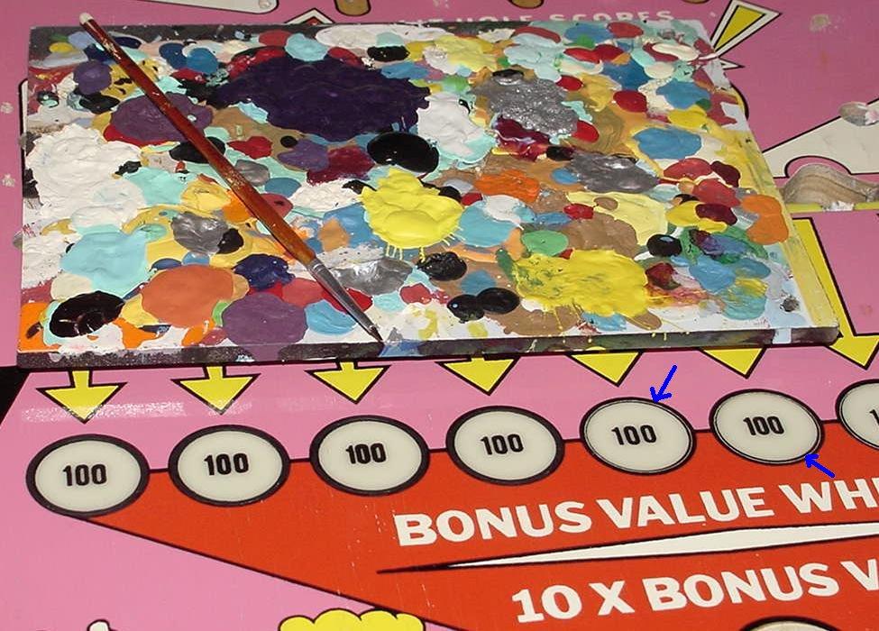 Before I can start filling the cupped lamp inserts, I need to touchup the playfield. This includes the black keylines around the inserts. Really can't start the cup filling until this done. Below is a picture of the left most four inserts that are touched up with black acrylic craft paint. The two inserts on the right (blue arrows) shows the wear around that is being touched up. On this playfield that whole process took less than one hour. |