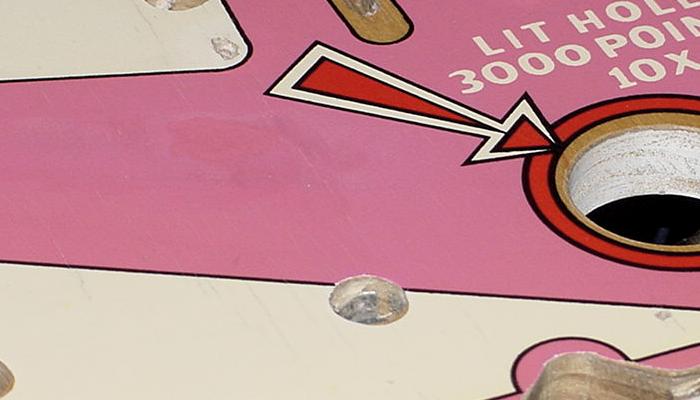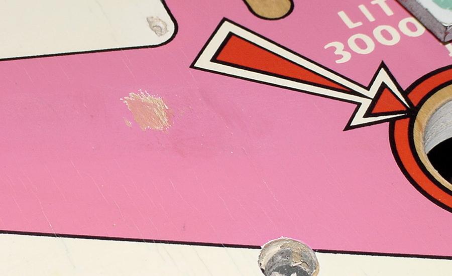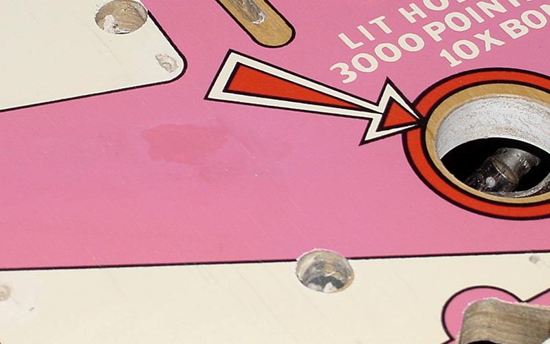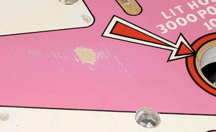 Cupped Inserts. Though this playfield is in very nice original condition, the main problem are the cupped inserts. This affects the play of the game, so it's best to have flat inserts. I've fixed this on other games by removing the insert and either filling them or sanding them flat. But in this case, that's not really an option. These inserts are not loose, which would make removing them difficult. And the chance of damage is too great. So another technique is needed to fill the concave face of the inserts. To do this I will use some clearcoat as the filler. But before I can do that, I need to make sure all the touchups are done first. The picture below shows how much this insert is cupped. |
