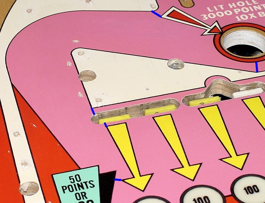 Here's the new target installed, and an arrow showing where the metal was removed to make this easier. How does it work? Seems to be fine! But I will place the game a lot and report back with the results. |