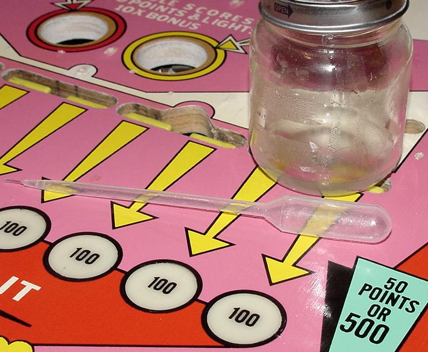 Now I mixed up some Auto Urethane clearcoat. This is a two part catalyzed clearcoat, and is what I will use to clearcoat the whole playfield. The stuff has "high solids", which means it doesn't shrink a lot during/after drying (and it doesn't require thinning). After mixing some, I use a plastic pipette and apply the clear to the playfield inserts. This builds up the cupped portion of the playfield. Note the playfield needs to be level while doing this, so the urethane clear stays inside the cupped area of the playfield lamp insert. I fill the insert right to (and including) the black keyline around the insert, and then let it dry for about four hours. After this no sanding is required, it's all ready for clearcoat. |