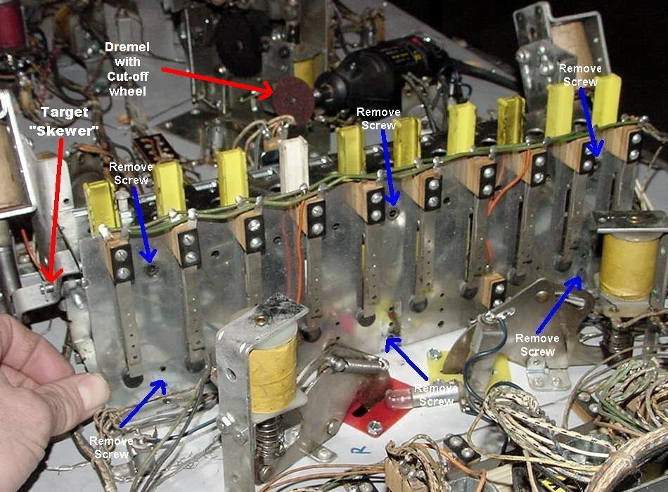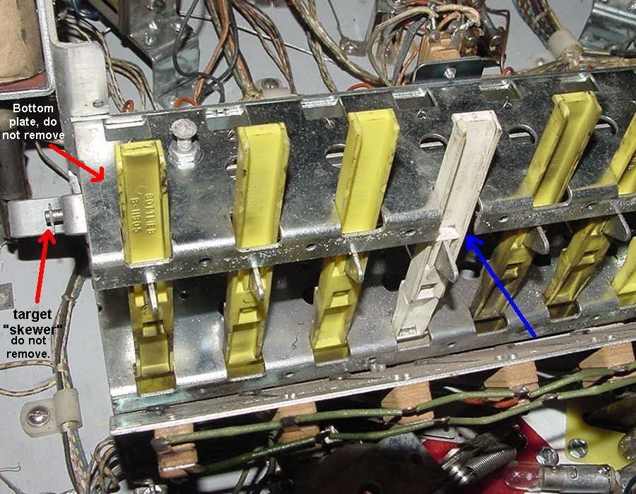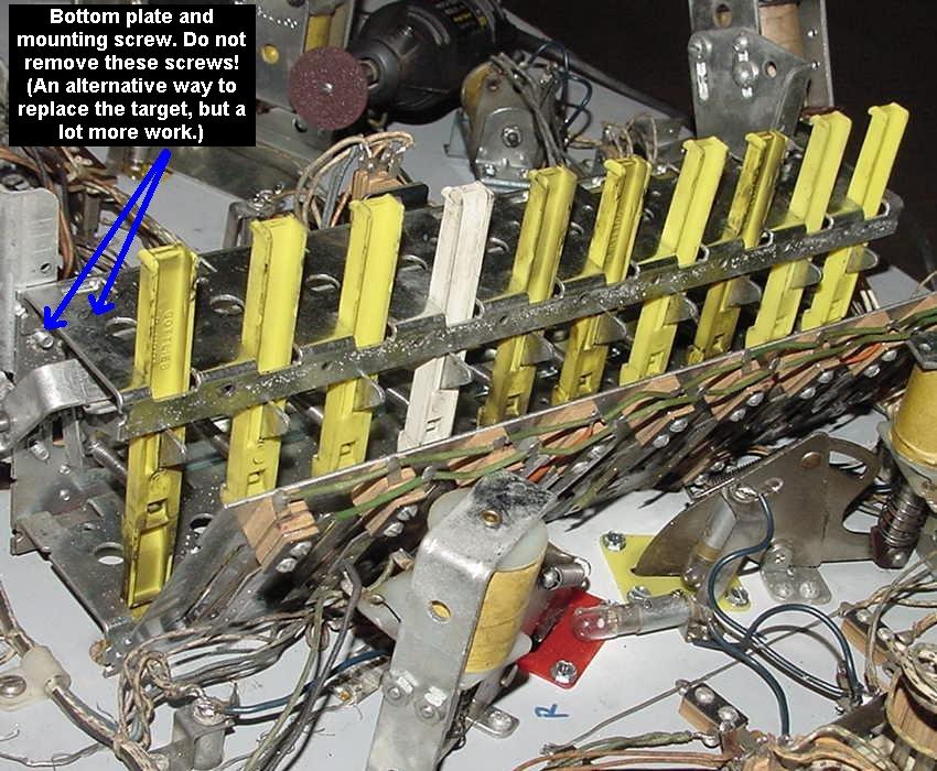 Drop Target Replacement (Playfield Reassembly). Now that the clearcoating is done, it's time to reassemble the playfield. One of the drop targets was replaced by someone else and is the wrong color (white instead of yellow). These targets are available brand new from Pinball Resource. But replacing a drop target on a Gottlieb EM is a major headache, especially on a 10-target bank. First, forget the other methods you've read on replacing Gottlieb drop targets, as they are WAY more difficult than this method. If you do the following, any future replacement takes about five minutes. The other methods I've seen are laborious at best. As we did in the disassembly process, disconnect the playfield connectors from the bottom board and the backbox connector. Then flip the playfield upside down and rest it perpendicular on the side rails of the game. This makes replacing a drop target a lot easier. Just make sure the pop bumper caps aren't touching the side rails. Typically the way this is done is to remove the back metal backing plate (six screws) on the drop target assembly, and them remove the broken target. The problem is getting the old target out (especially if it's a target in the middle of the bank - end targets are easier to replace in this regard.) To get a target out the 'skewer' has to be removed, or the bottom metal bracket loosened (hopefully not removed). The problem is, especially on a target in the middle of the bank, removing the skewer or the bottom bracket releases all the other targets (that is, the ones you don't want to remove). This makes a huge mess in re-assembly. Yes the skewer can be partially pulled out to minimize this problem, or the bottom plate loosened and angled up, but again if it's a middle target that is being replaced, this creates a lot of extra work. That's because all the other target parts and springs can come apart, making this a major headache. Also yes the bottom bracket can be loosened (not removed!) and angled out of the way, but again, the potential for problems is huge. First step is to remove the six screws that hold the backing plate to the drop target assembly. Below is a picture of the screws that need to be removed. |