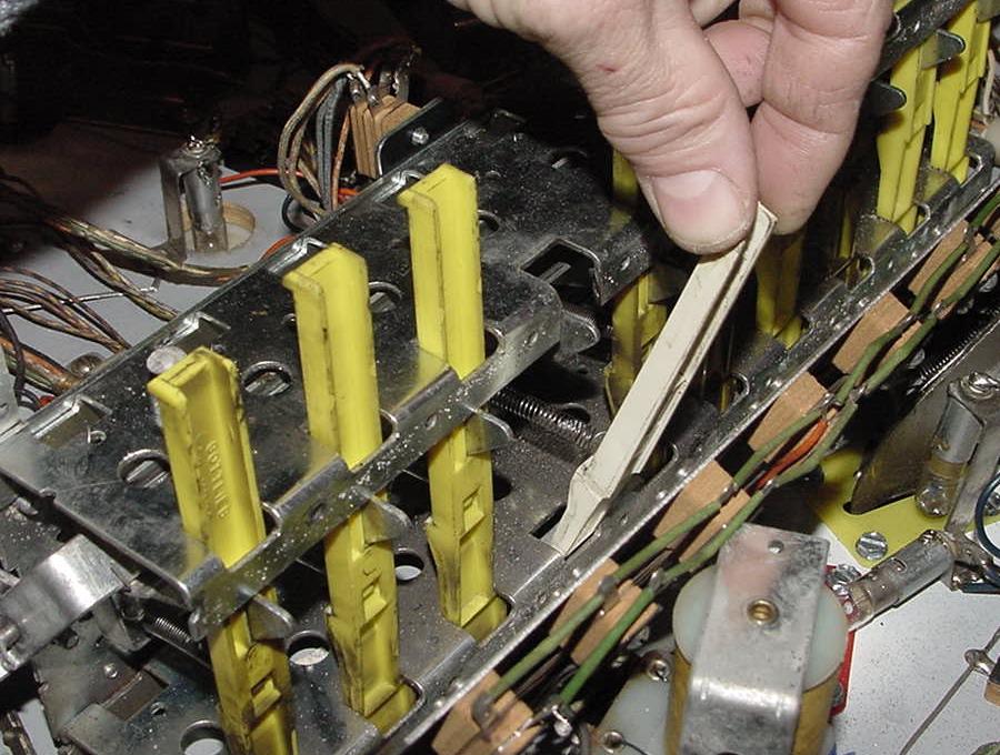 Now the target can be easily pulled back, and the attachment spring released. Then the target can be removed from the top side of the playfield. A new target is then slid into place, and the spring reattached. Using a hemostat to hold the spring works best to do this. But replacing a target in this manner is WAY easier than removing the target 'skewer' or loosening the bottom bracket. |