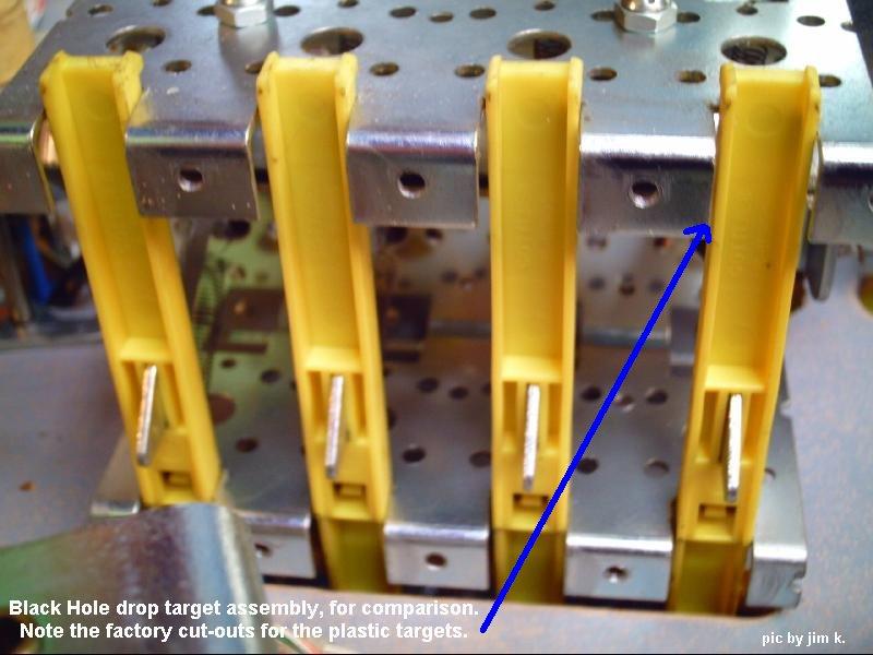 For comparison, here's a picture of a Black Hole drop target assembly. See where it was cut by the factory to ease in target replacement. Note Gottlieb even cut the metal closest to the playfield. But frankly this is just not needed, so don't bother. This is essentially what we have done on the EM Jumpin Jack target assembly. |