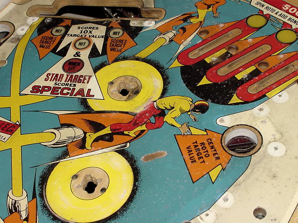 Conclusion. Though the final product of the playfield work came out fine, I'm still not 100% sure I like Gottliet Jetspin that much. I guess I'm more of a drop target guy. But the roto-target, vari-target, and that tricky left lane shot do have their fans. I guess I'll have to play the Gottlieb Jet Spin a bit more to get some better data... More information on clearcoating can be seen in the "This Old Pinball" videos TOP #1,3,4,7. This shows the whole procedure of touching up and clearcoating a pinball playfields. Also see Pinball Restoration Guide, part two and the Gottlieb Quickdraw playfield restoration and Gottlieb 2001 playfield restoration web pages for more info.