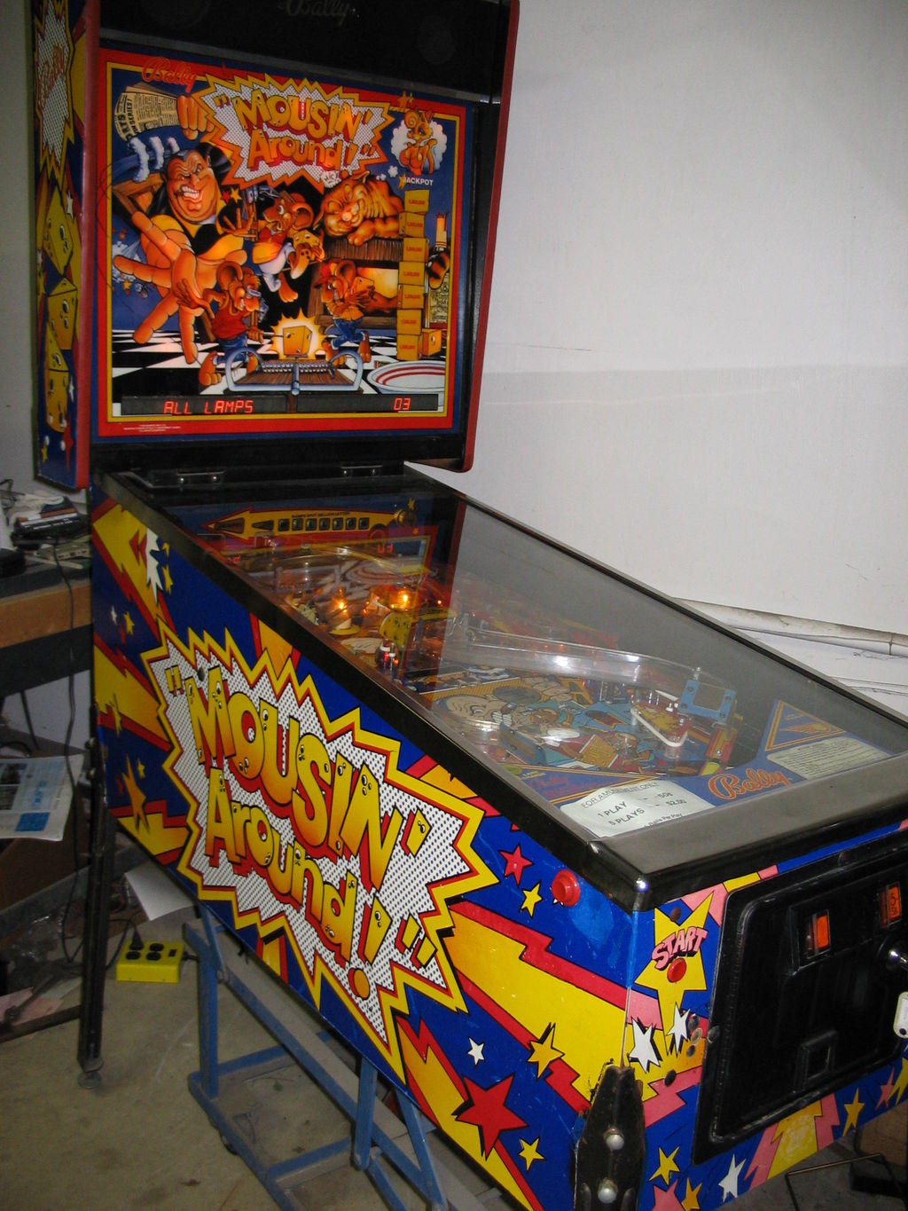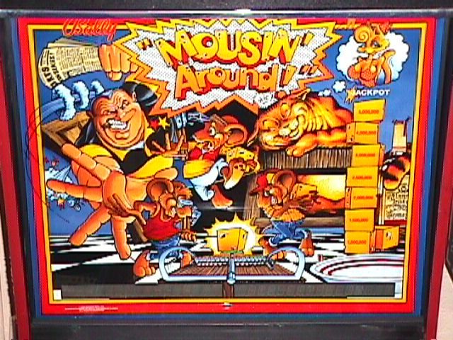 Description: Description: Mousin' Around, Bally/Williams, 12/89, Interesting Ward Pemberton design with cheese block ball grabbers. Williams system11b solidstate design. Has the Bally name but is really a Williams game. If you have a Bally/Williams Mousing Around pinball for sale in Michigan, please contact me at cfh@provide.net