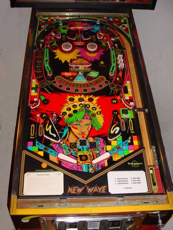 Description: 1985 Bell Games New Wave, Bell Games (Italy), 1985, Solid State based on Bally -35 system. Conversion kit for Bally Black Pyramid. If you have a Bell New Wave pinball for sale please contact me at cfh@provide.net
