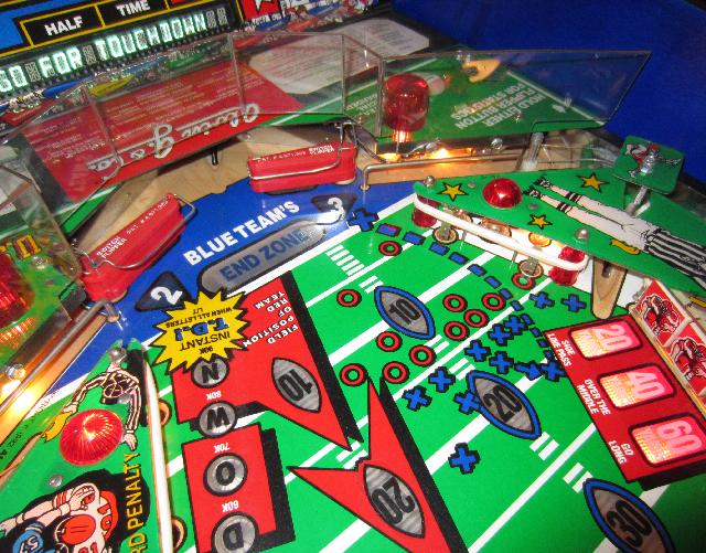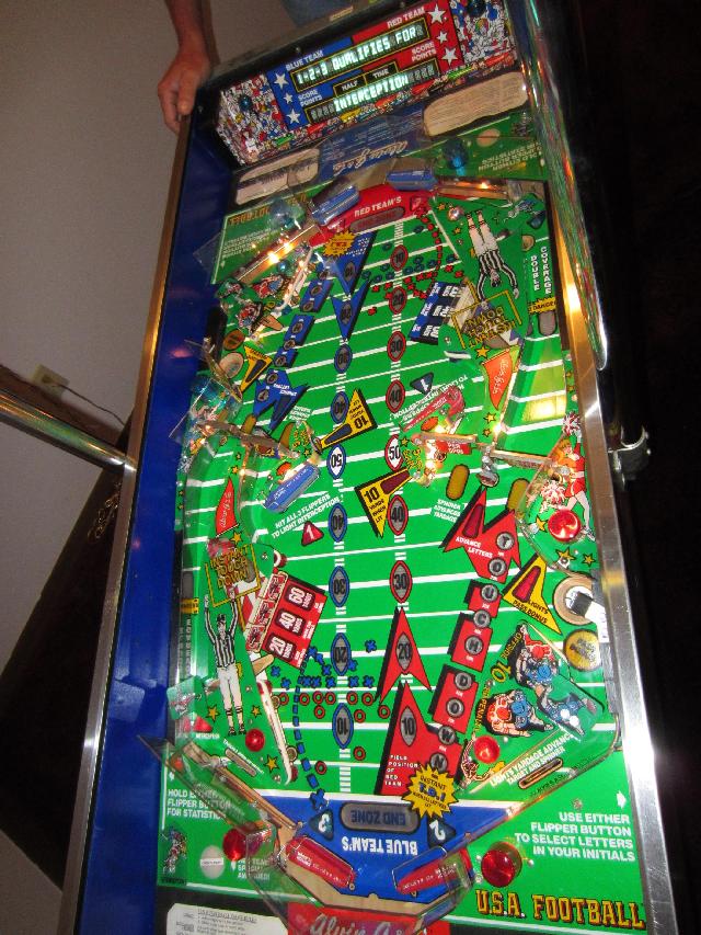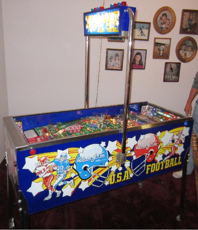 1992 Alvin G. A.G. Soccer Ball pinball Description: 1992 Alvin G U.S.A. Foot ball pinball machine. A head to head game made by Alvin Gottlieb, where the players stand at either end of the machine, and play simultaneously. They made two version of this game - USA Football and an Alvin G. AG Soccer Ball (A.G. Soccer-ball) pinball model. It's the exact same game, just different graphics/theme. There were 500 made of each model for a total production of 1000 games. Uses blue Futaba score displays (like Gottlieb system80b). Also has flipper switches so the game can be played in one player mode against the computer. If you have a Alvin G. USA Football or A. G. Soccerball pinball for sale please contact me at cfh@provide.net