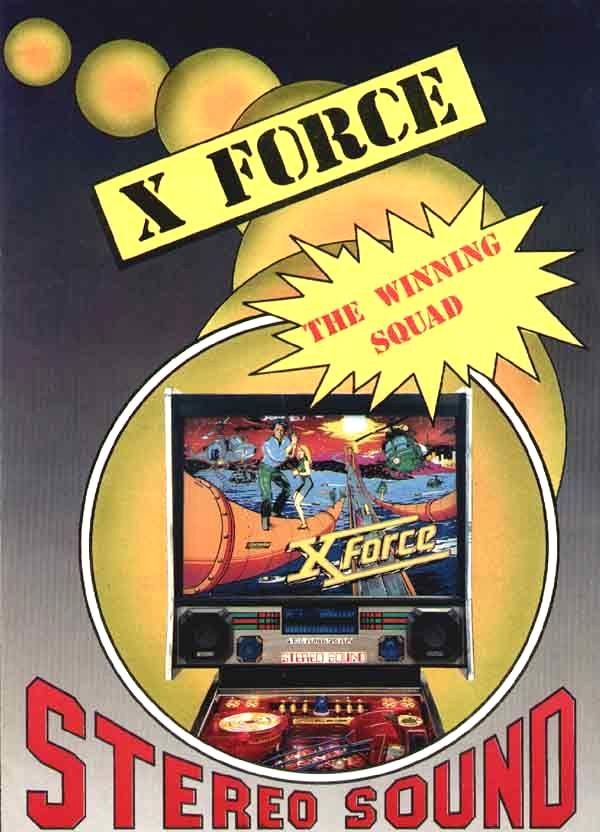 Description: Xforce, Tecnplay, 1987. Tecnoplay was basically Zaccaria after a bankrupcy. Note the graphics of the guy/girl on the playfield between the flippers is very similar to the graphics on Bally's Spy Hunter pinball. The manual for the game is here in PDF format (5meg).