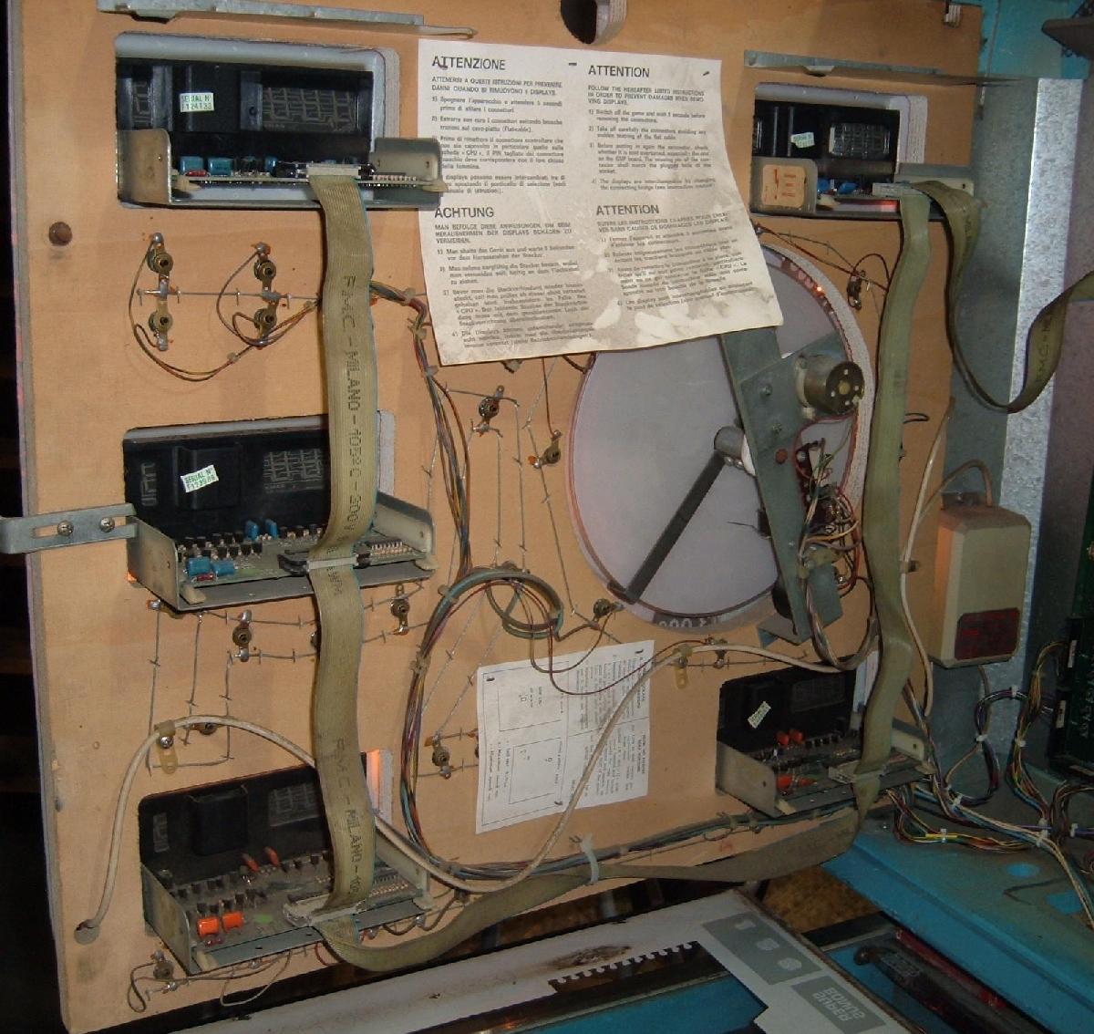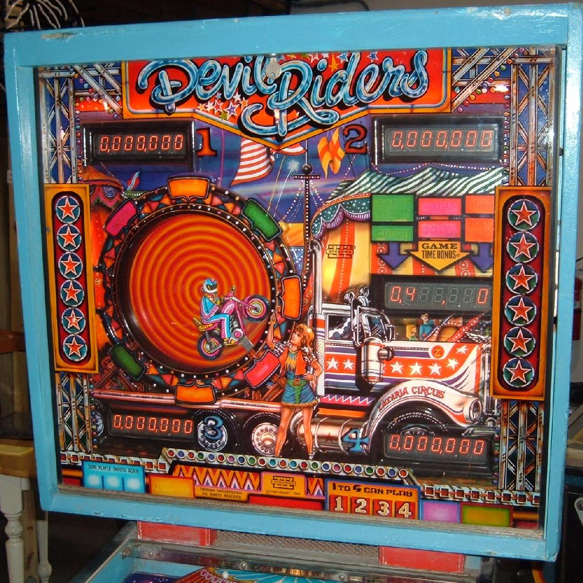 Description: 1984 Zaccaria Devil Rider, Zaccaria, 4/84, Four pop bumpers, two playfields and six flippers (two on the main playfield, two on the upper transparent playfield, and two "React" flippers to flip the ball back up from the outlanes as a save.) Elevated ball shooter lane. Backglass animation (a motorcycle performs loops each time the ball enters the upper playfield). Neon light in the backglass. No multiball. Uses 1B1165/1 MPU, five 1B13123 (7 Digit) Display boards, 1B11136/0 Sound board, 1B1166 driver board, and 1B11167/0 Power Supply board. Has very interesting speech. Single ball (not multiball.) If you have a Zaccaria Devil Rider pinball for sale please contact me at cfh@provide.net