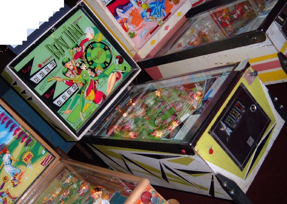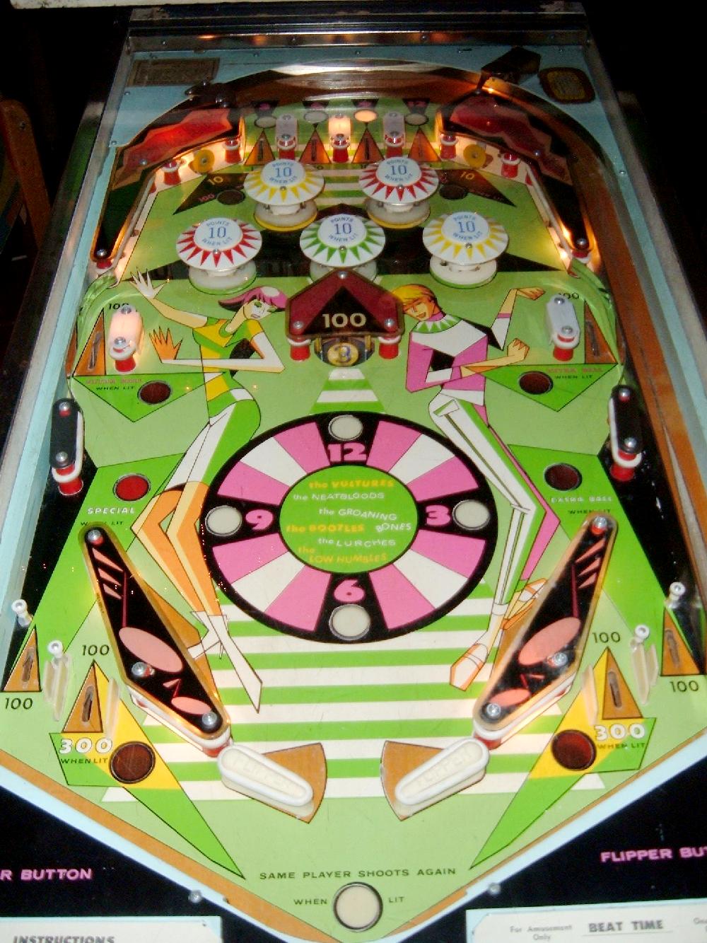 Description: Williams Beat Time, 9/67, four player, two 2" Flippers, five Pop bumpers, two Slingshots, one Rotating targets with four targets (neat feature), two Standup targets, Left and right dual outlanes. Williams Beat Time took advantage of the musical group The Beatles, and used this unlicensed pinball, changin the name of the group to The Bootles. But clearly from the art they are representing The Beatles. There is also a reissue backglass of this game available with "The Beatles" on the glass instead of "The Bootles." The game itself is nothing to really look at, in fact it has the ugly pointy art and a rather sick green color. Game play is decent if you can get past the art work. But the Bootles/Beatles connection makes the game somewhat cool. They made 2,802 Williams Beat Time pinballs, and it was designed by Steve Kordek and art by Jerry Kelley. If you have a Williams Beat Time pinball for sale, please contact me at cfh@provide.net