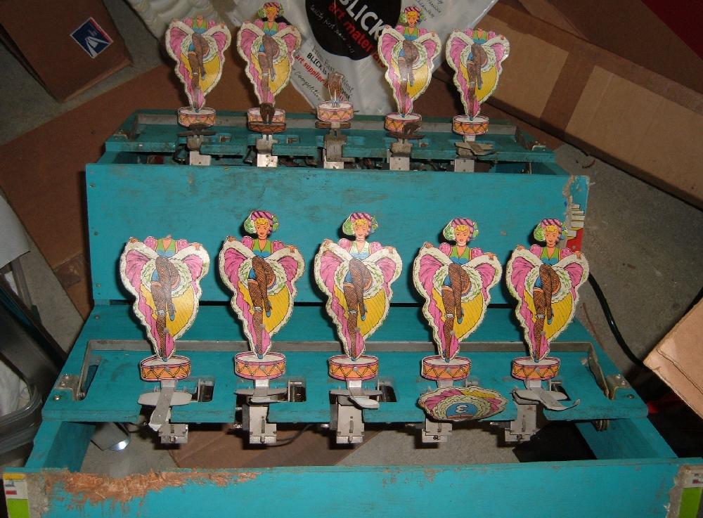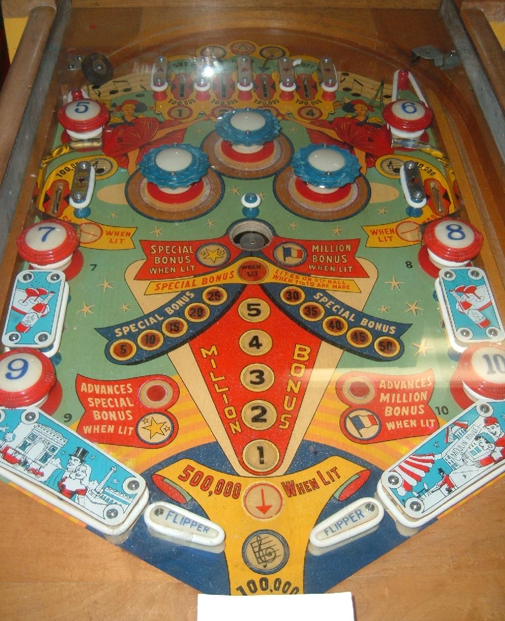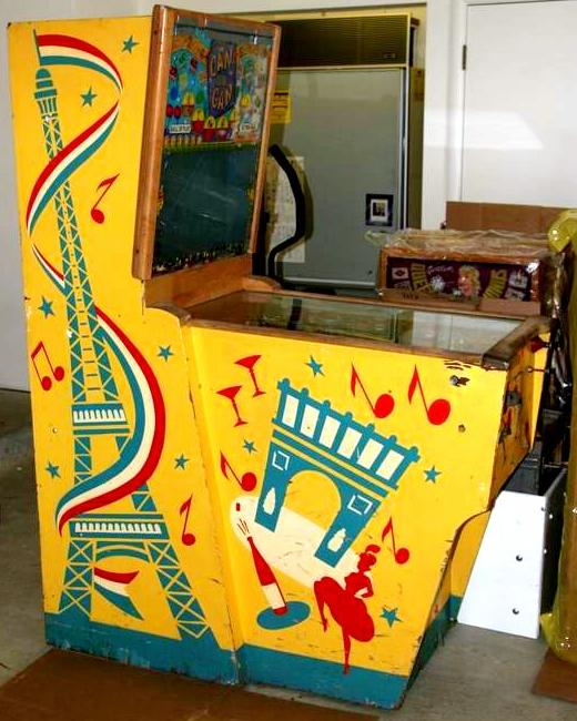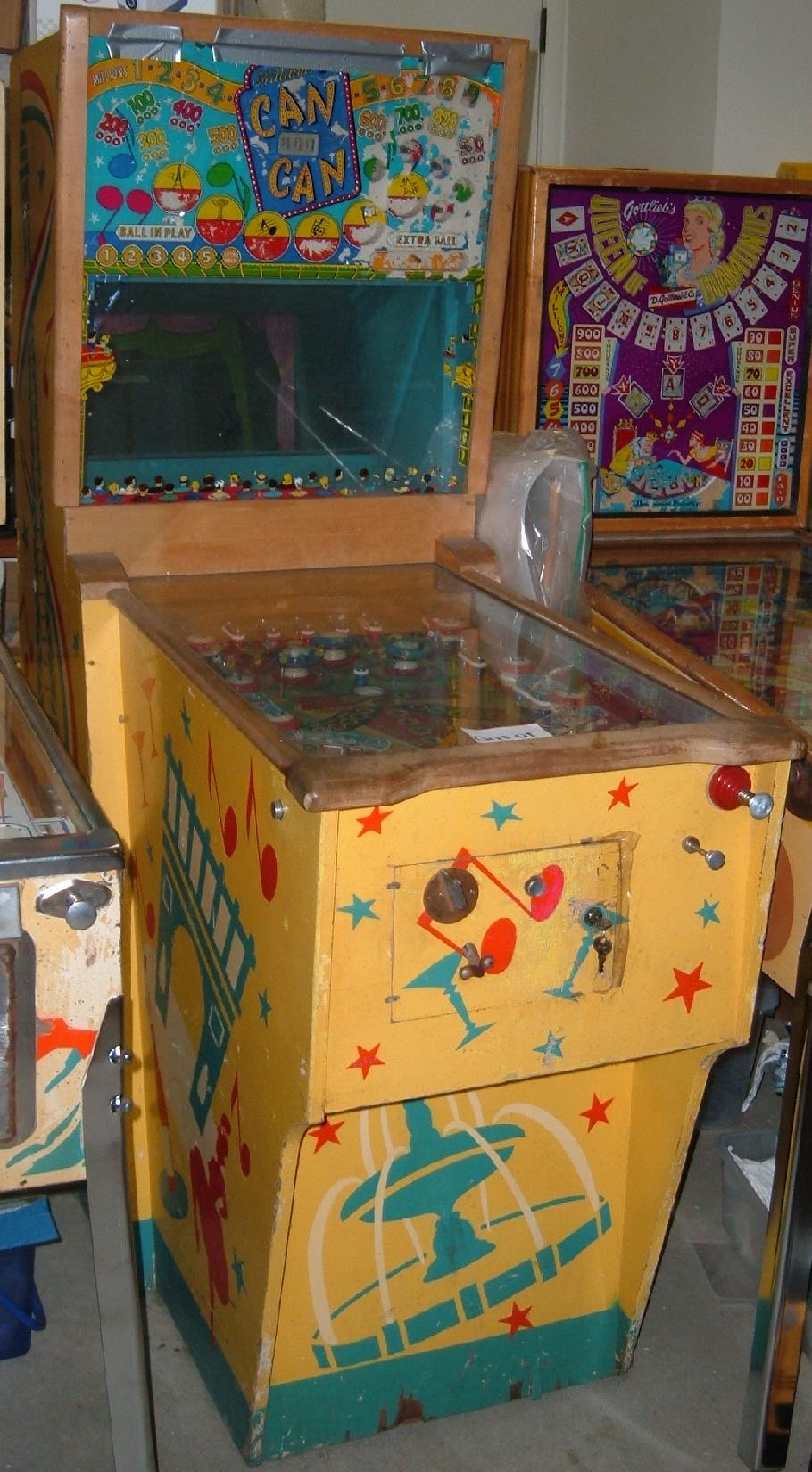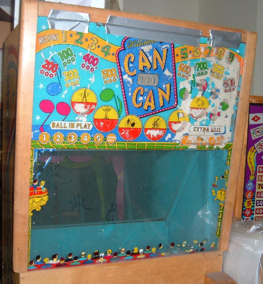 Description: Can Can #135, 8/55, Star feature, animated backglass, one gobble hole and two kickout holes. Williams CanCan has two rows of "Can Can" dancers that appear in the backbox! The dancers (cardboard cutouts) are actually located in the back of the machine below and behind the playfield. They are reflected by a 45 degree mirror behind the backglass. When you hit certain things on the playfield, a dancer goes from a front view (kicking up her leg) to showing her bum (with a number on it). The object is to "flip over" all the dancers. Has a 3 digit credit unit that goes to 199 credits (gambling machine). If you have a Williams CanCan pinball game for sale please contact me at cfh@provide.net