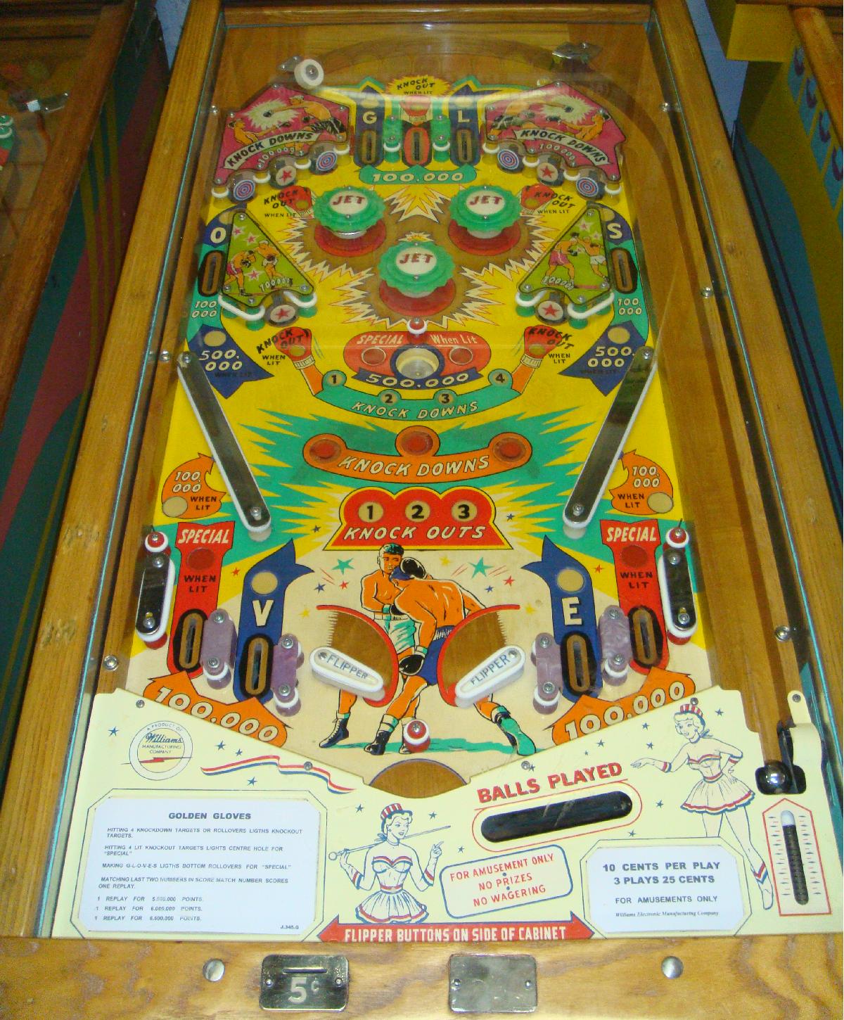 Description: Golden Gloves #228, 1/60, one gobble hole, game design by Harry Mabs, If you have this pinball game for sale please contact me at cfh@provide.net