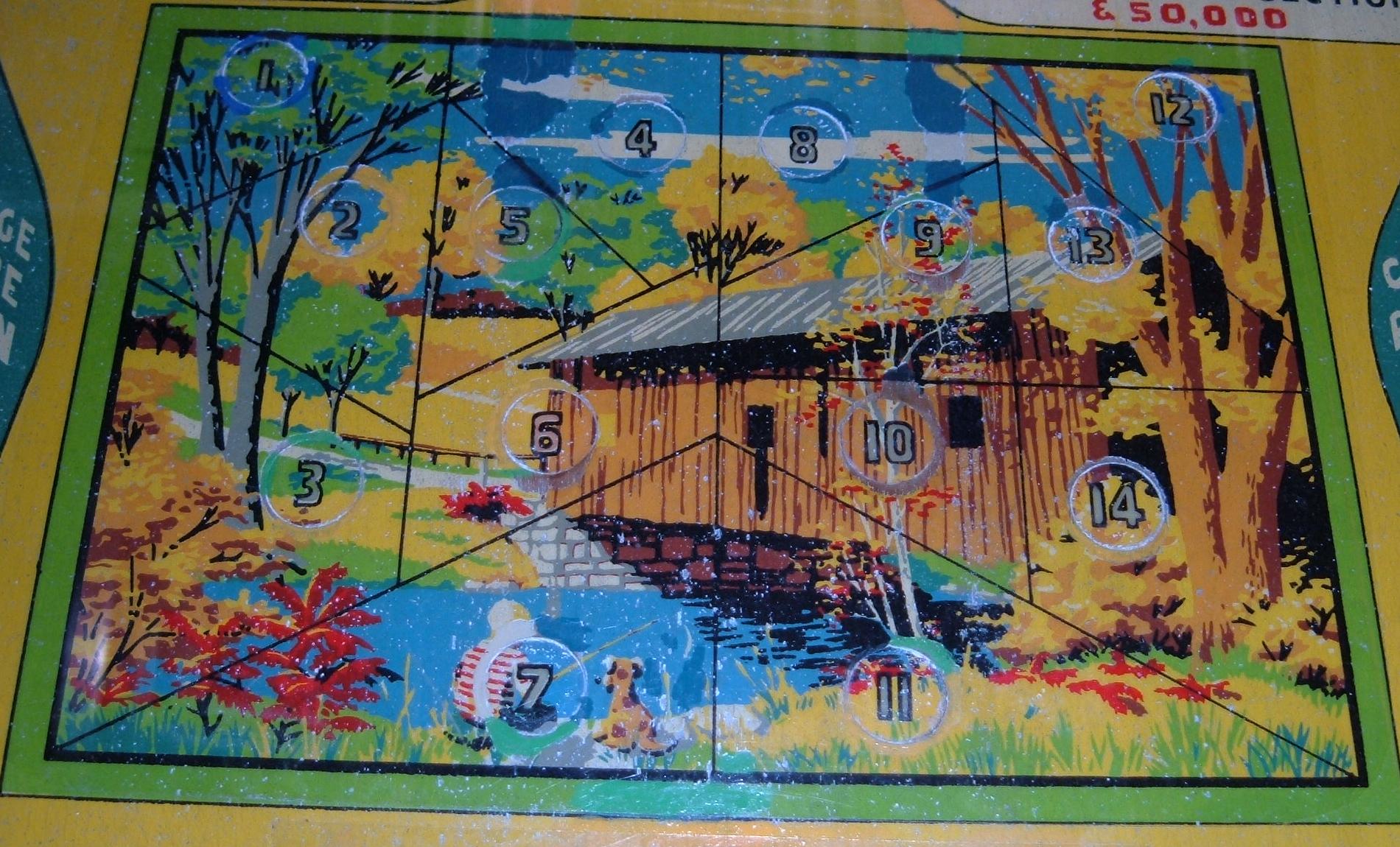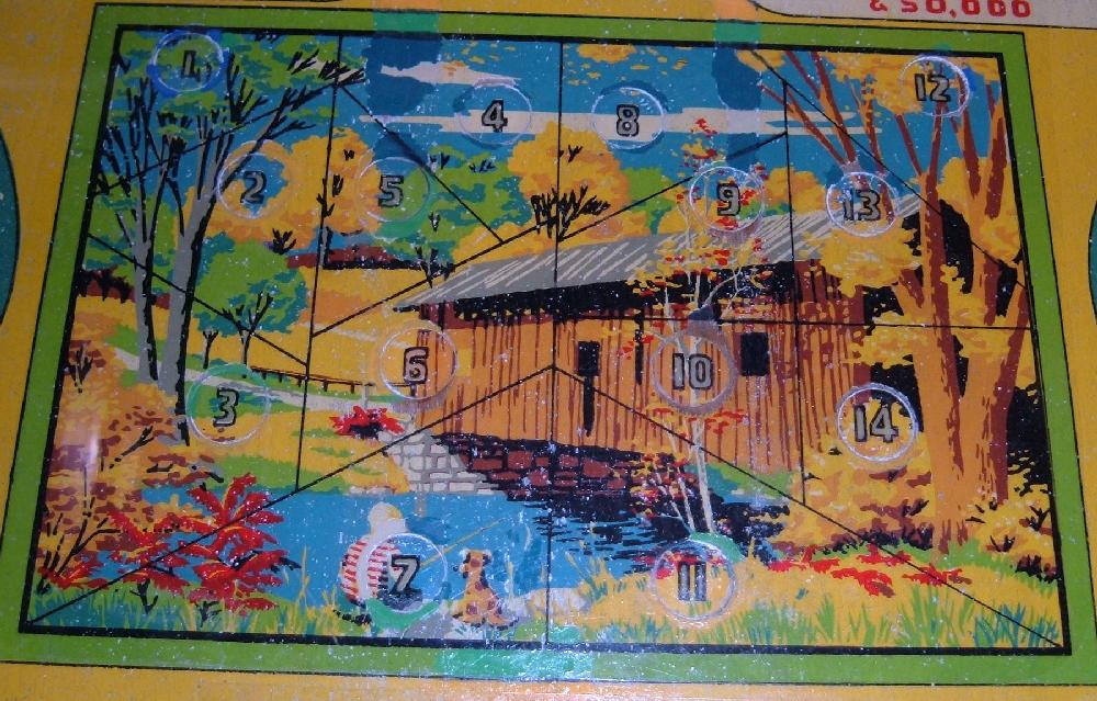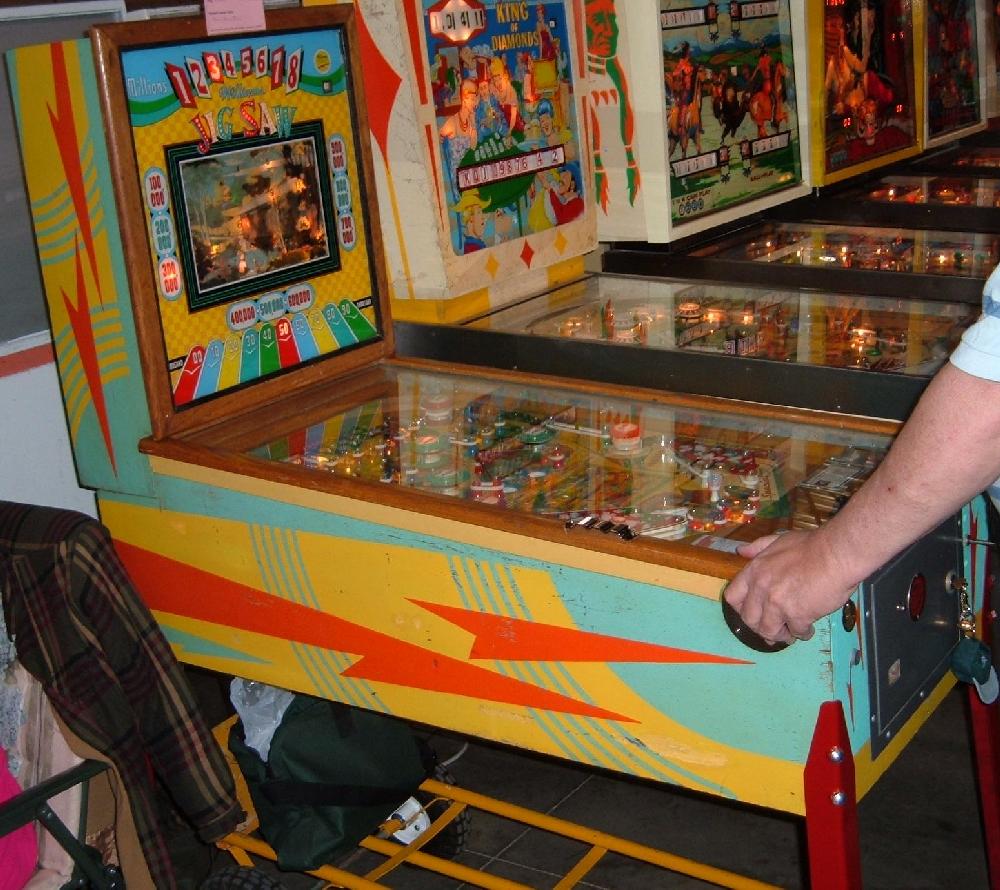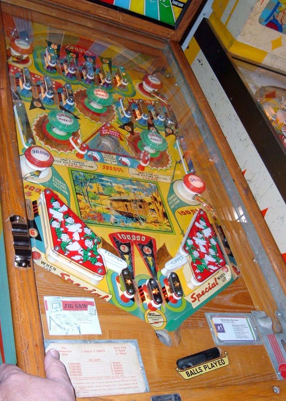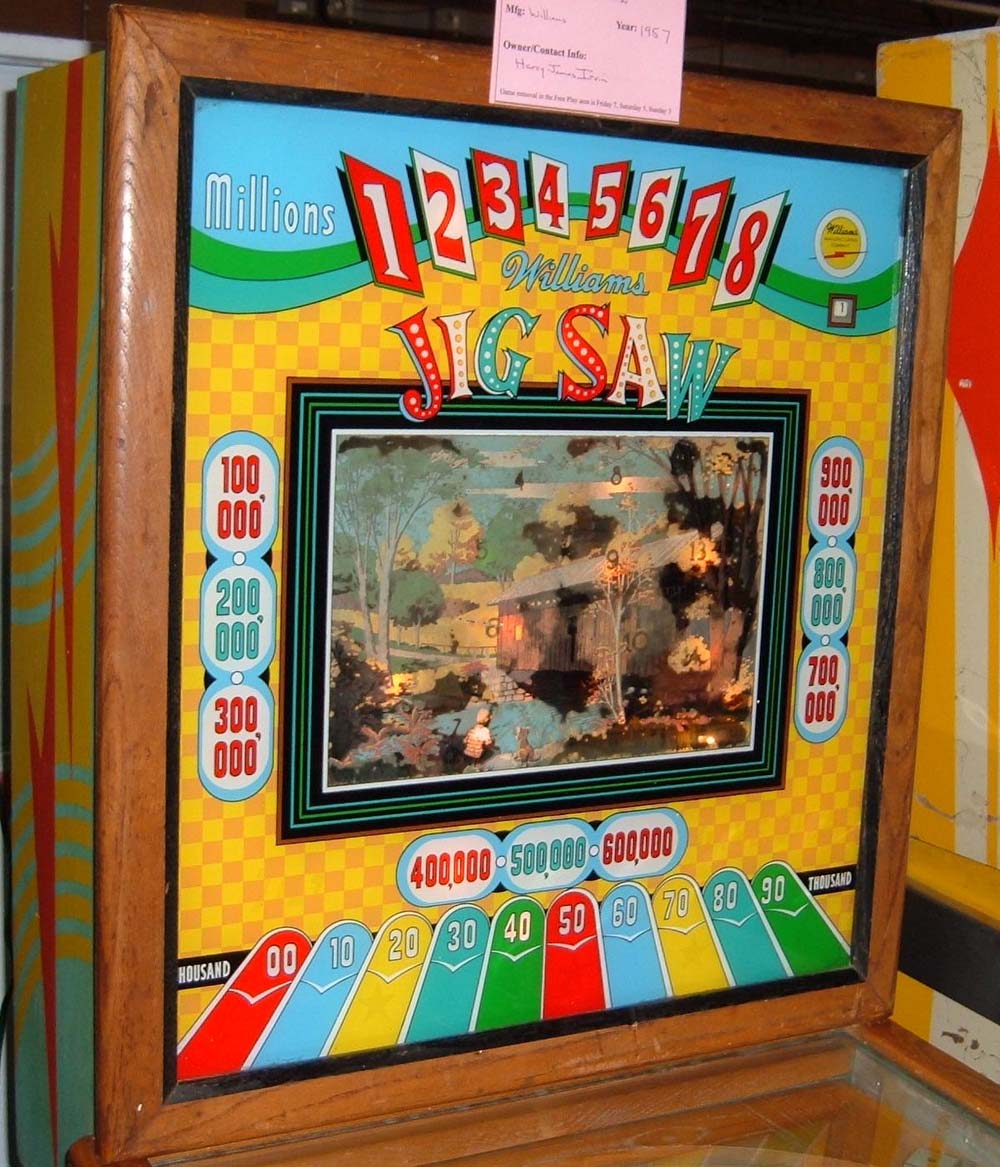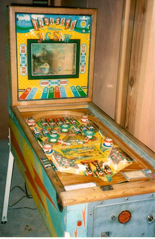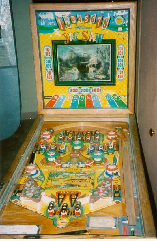 Description: Jig Saw #193, 11/57, in Jigsaw completing the roll-overs lights the backglass jig saw puzzle, one gobble hole and two kickout holes (to either side of the single gobble hole). The object is to rollover all the pieces of the puzzle, completing the lighted jigsaw puzzle in the backglass (and on the playfield). If you have a Williams Jigsaw pinball game for sale please contact me at cfh@provide.net