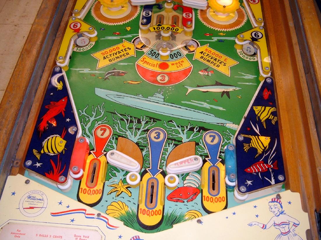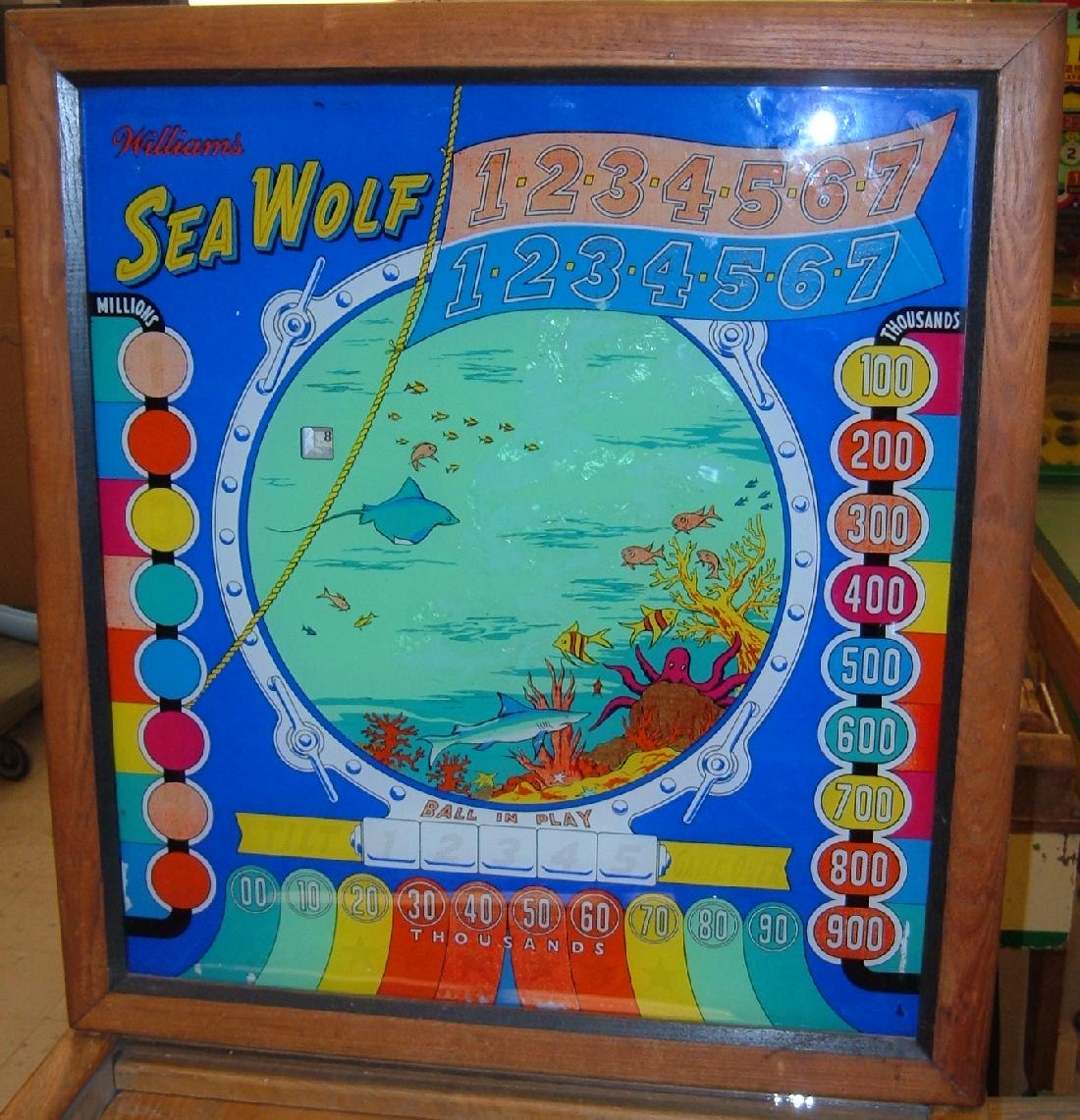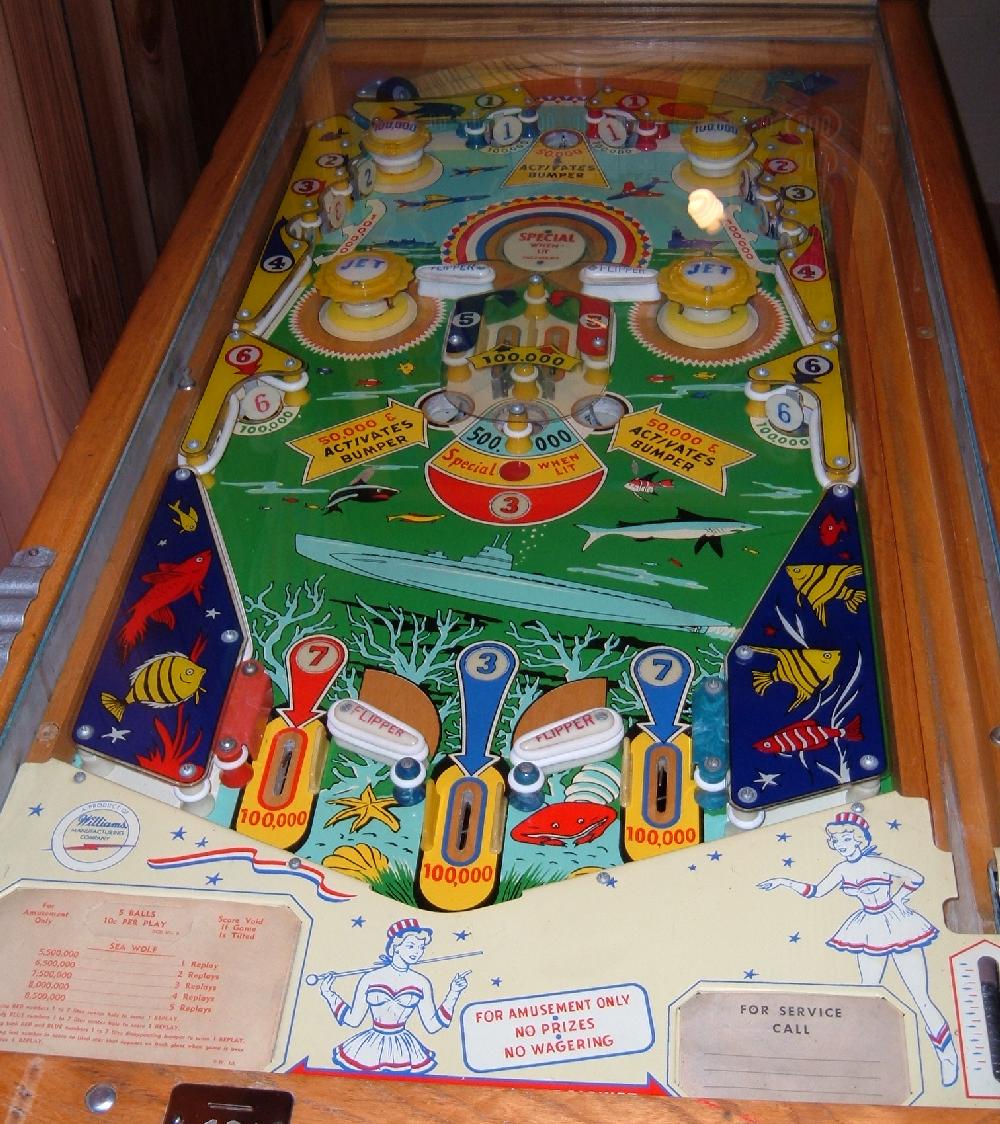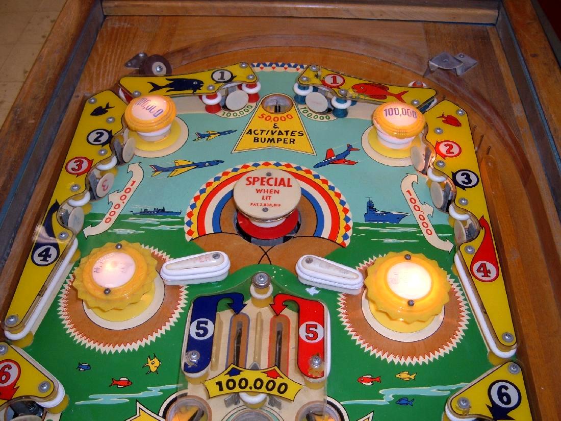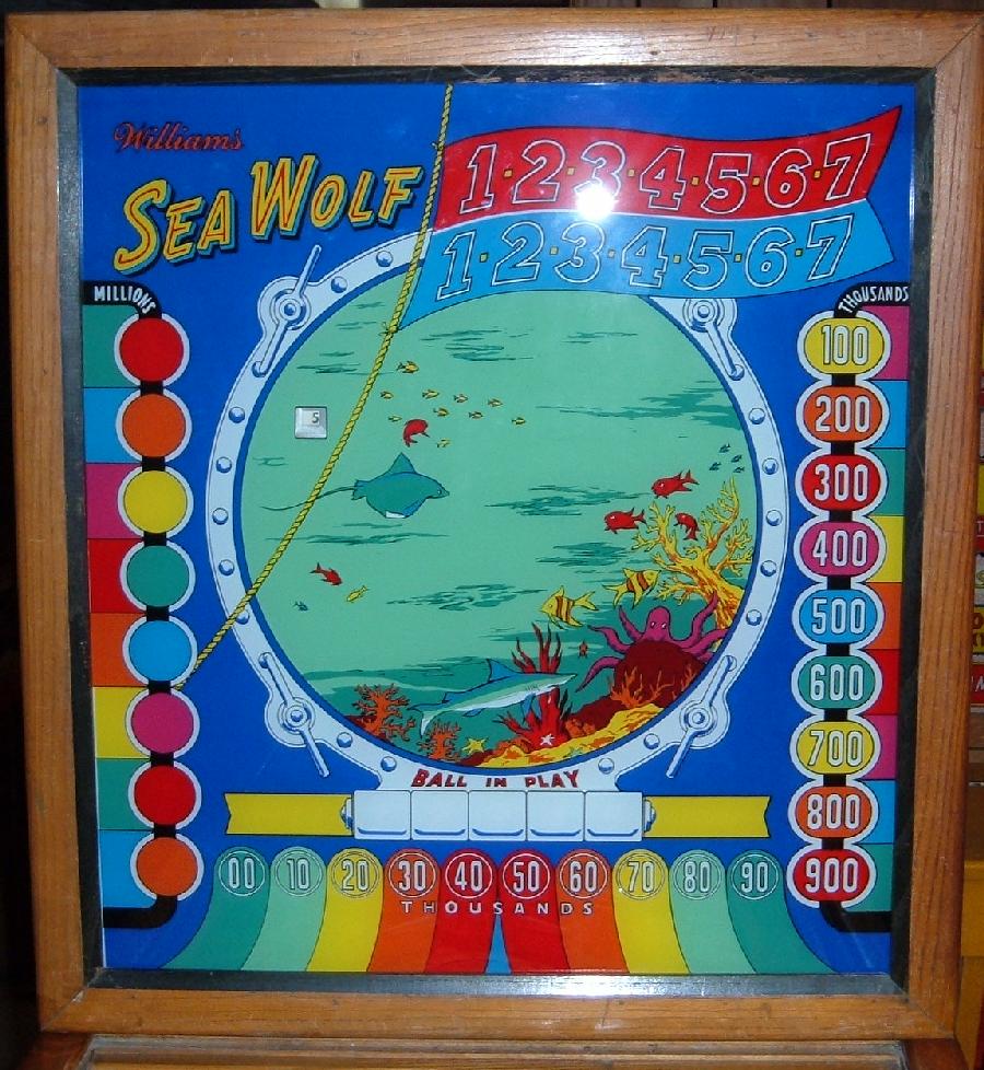 Description: Sea Wolf #209, 7/59, disappearing pop bumper like Gusher (1958), one gobble and two kickout holes, four flippers. Complete the 1-7 red or blue number targets to light the center gobble hole special. complete both 1-7 red and blue number targets to light the pop bumper for special. Each hit on the pop will give one special! If you have this pinball game for sale please contact me at cfh@provide.net