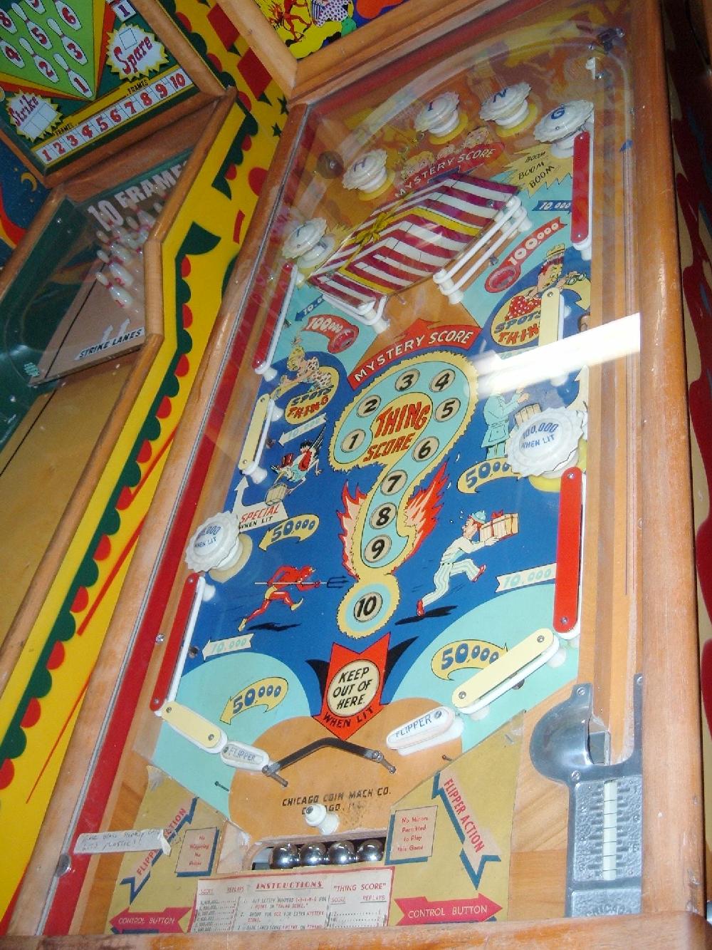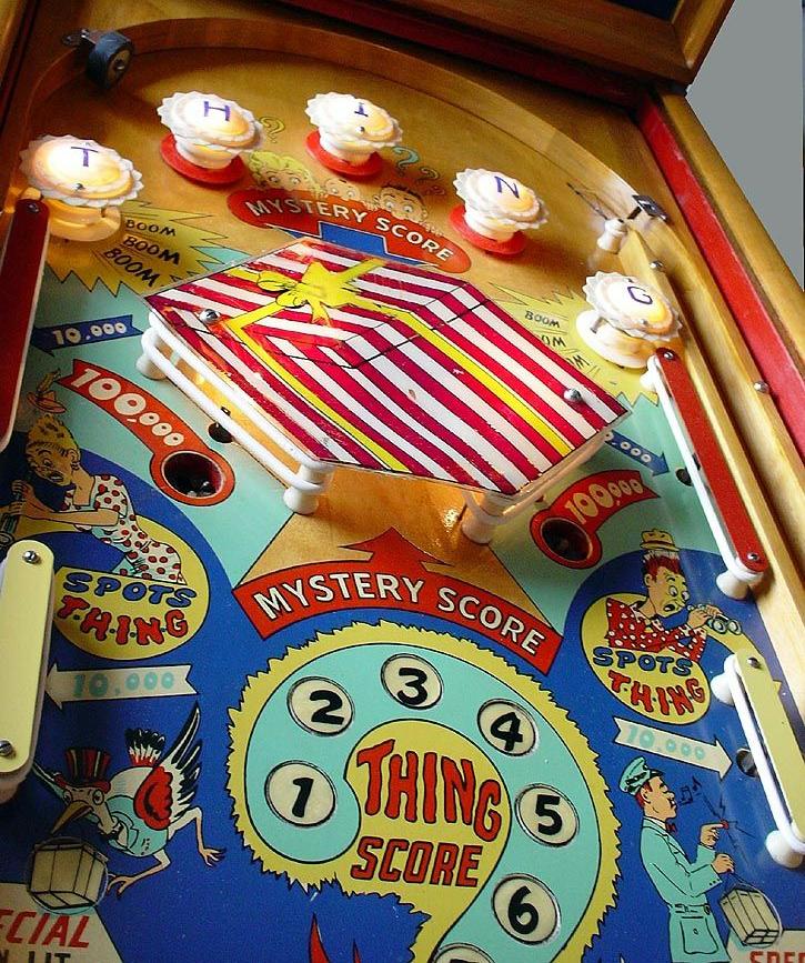 Description: The Thing, Chicago Coin Machines (CCM), 2/51, great artwork package and unusual game play. Has a mystery score area in the center, representing the "thing" box. Also has a Gottlieb-style safety gate between the flippers that saves the ball from draining. If you have a Chicago Coin Machine "Thing" pinball game for sale please contact me at cfh@provide.net