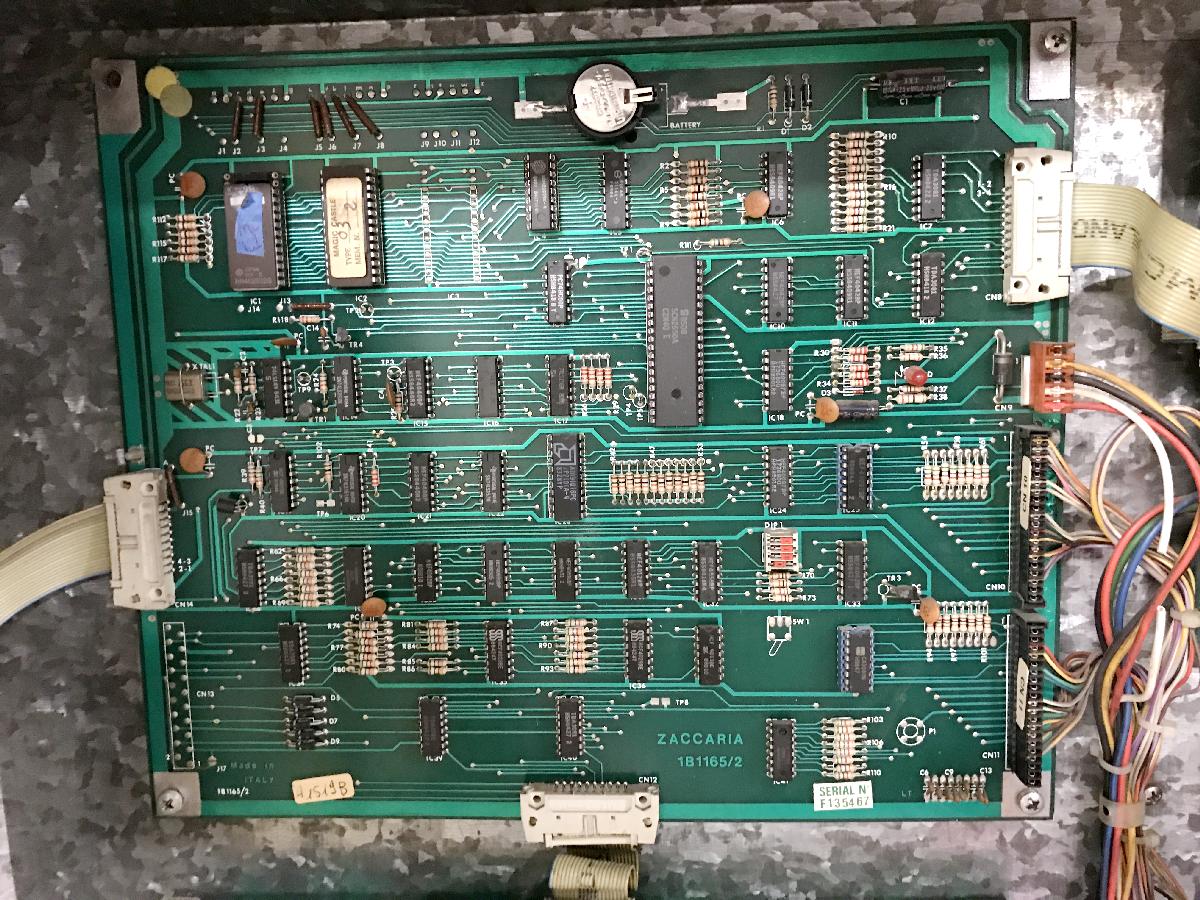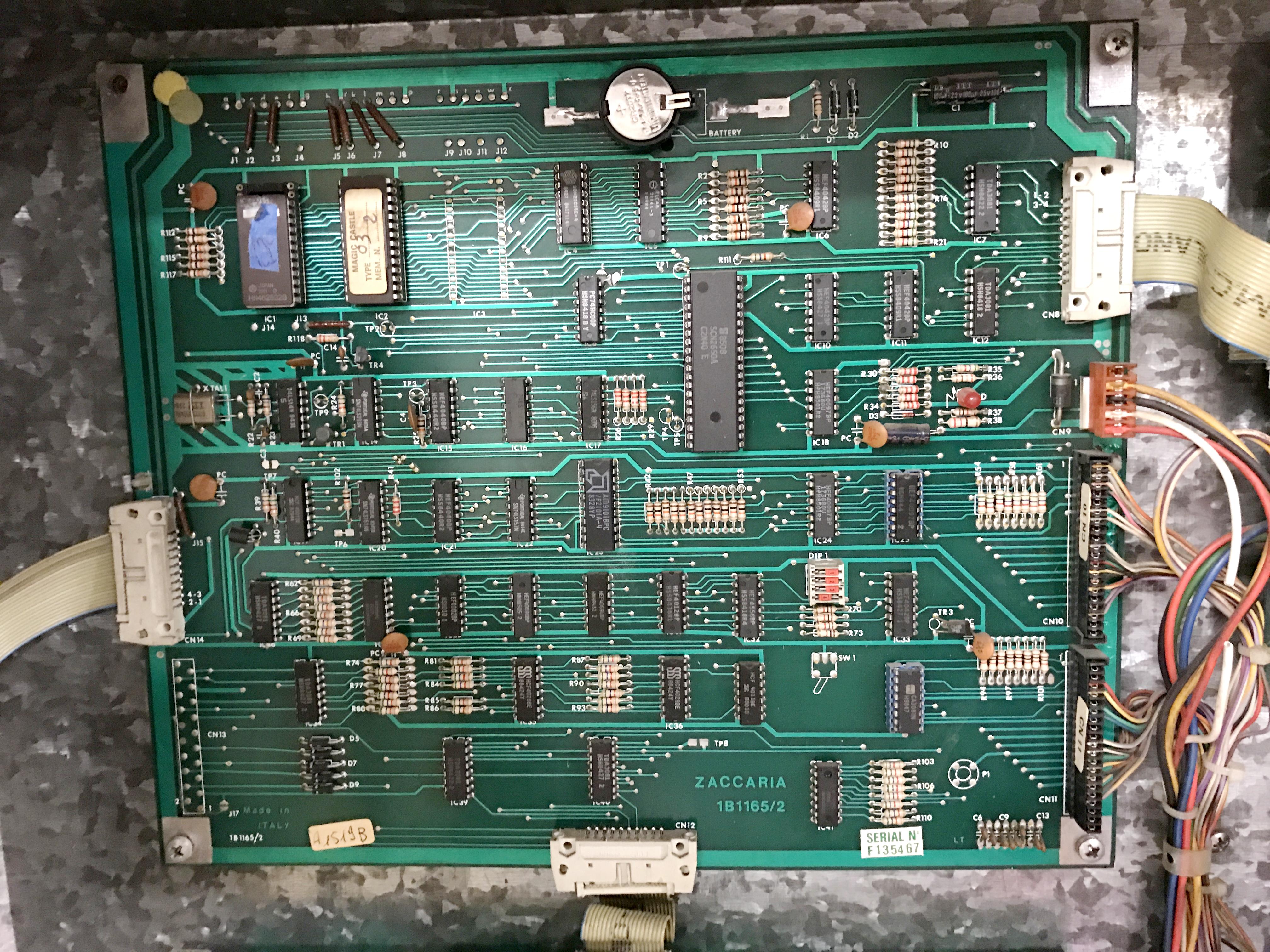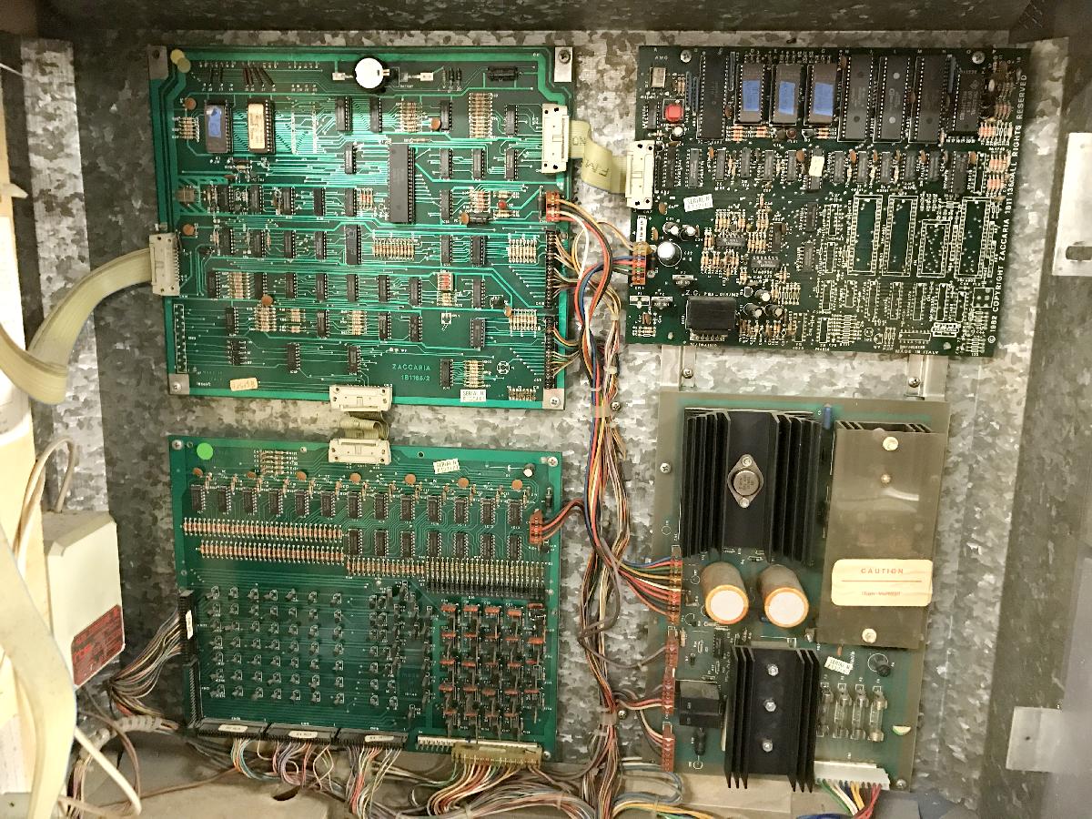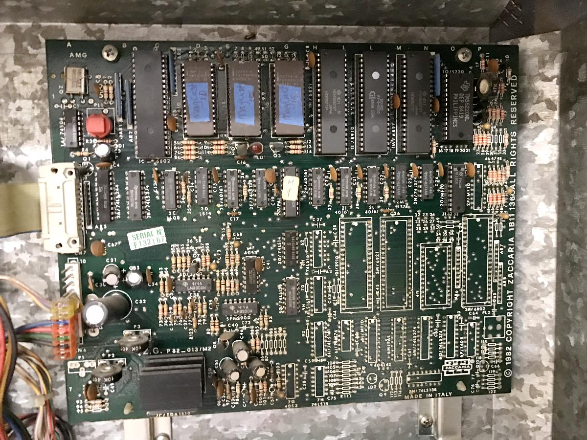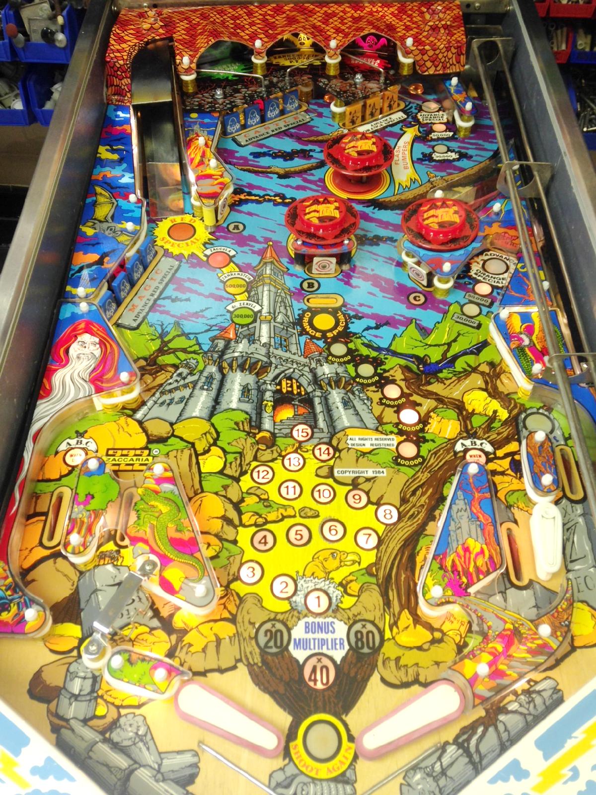 Description: 1984 Zaccaria Magic Castle, Zaccaria, 9/84, Four flippers and two 4-bank drop targets and a 3-bank drop target,and a single drop target. Small, raised upper playfield at top of ramp. Has speech, no multiball. One flipper used to save ball from draining on right outlane. Backglass animation of Zaccula in his castle. Neon light in the backglass. Uses 1B1165/2 MPU, five 1B11150/0 (8 Digit) Display boards, 1B11136/0 Sound board, 1B1166 driver board, and 1B11167/0 Power Supply board. If you have a Zaccaria Magic Castle pinball for sale please contact me at cfh@provide.net