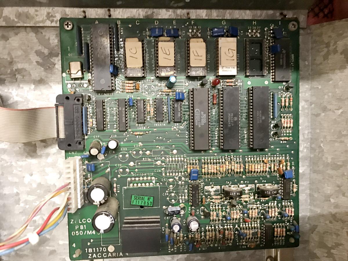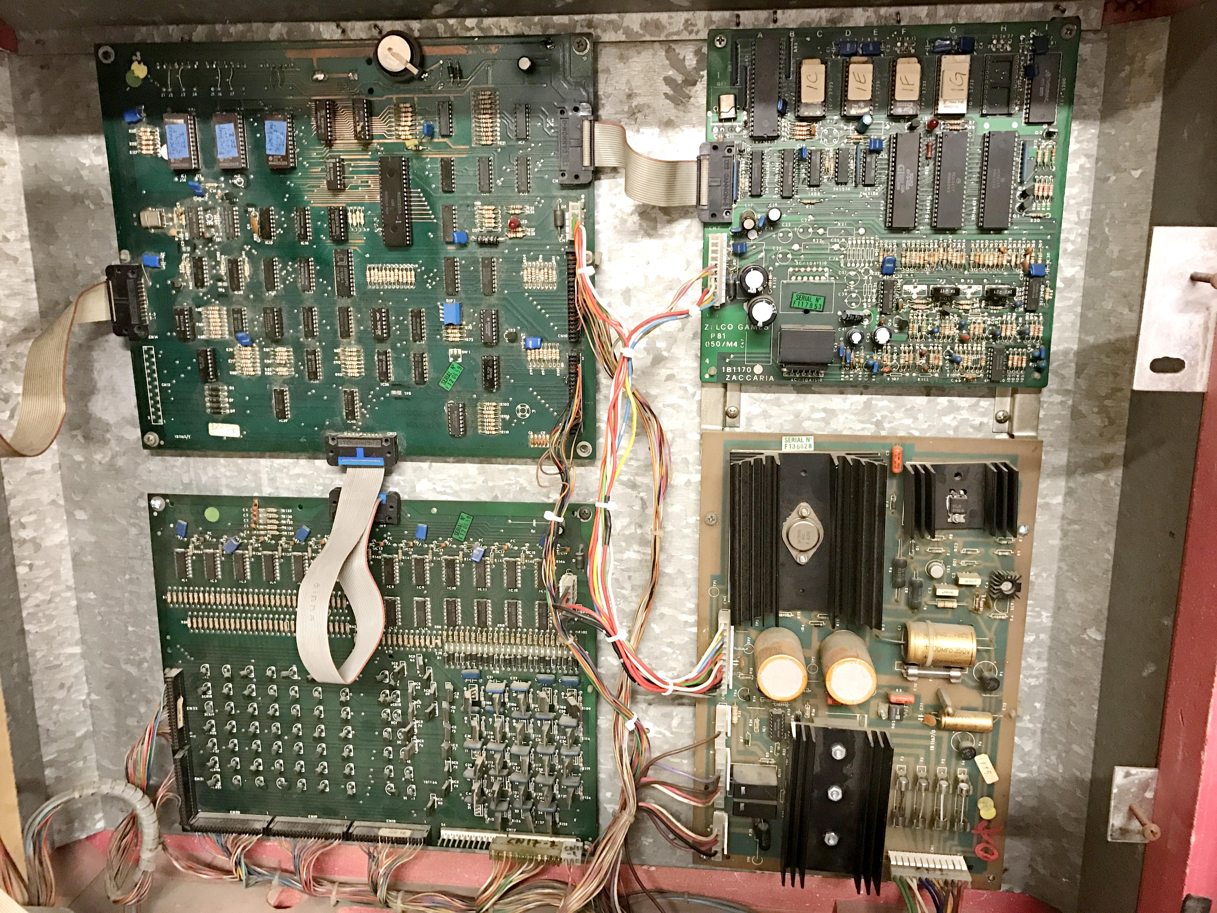 Description: 1982 Zaccaria Pinball Champ, Zaccaria, 4/82. Game was also made in April 1983 with just a slight artwork change (no "82" after "Pinball Champ".) Zaccaria's first multi-level game with two playfields, four flippers (two on the main playfield, two on the upper transparent playfield). Has speech., no multiball. Timed "bonus ball", elevated ball shooter lane. No multiball. An audio jack located on the cabinet front underneath the ball shooter allows listening to the game via headphones. Pinball Champ (1982) was the first of Zacccaria's second generation of Solid State games. Uses 1B1165 MPU, five 1B1168 (2x4 Digit) Display boards, 1B1170 Sound board, and 1B1167/0 Power Supply board. Early versions of this game have 6 digit displays (most have 7 digits though.) If you have a Zaccaria Pinball Champ pinball for sale please contact me at cfh@provide.net