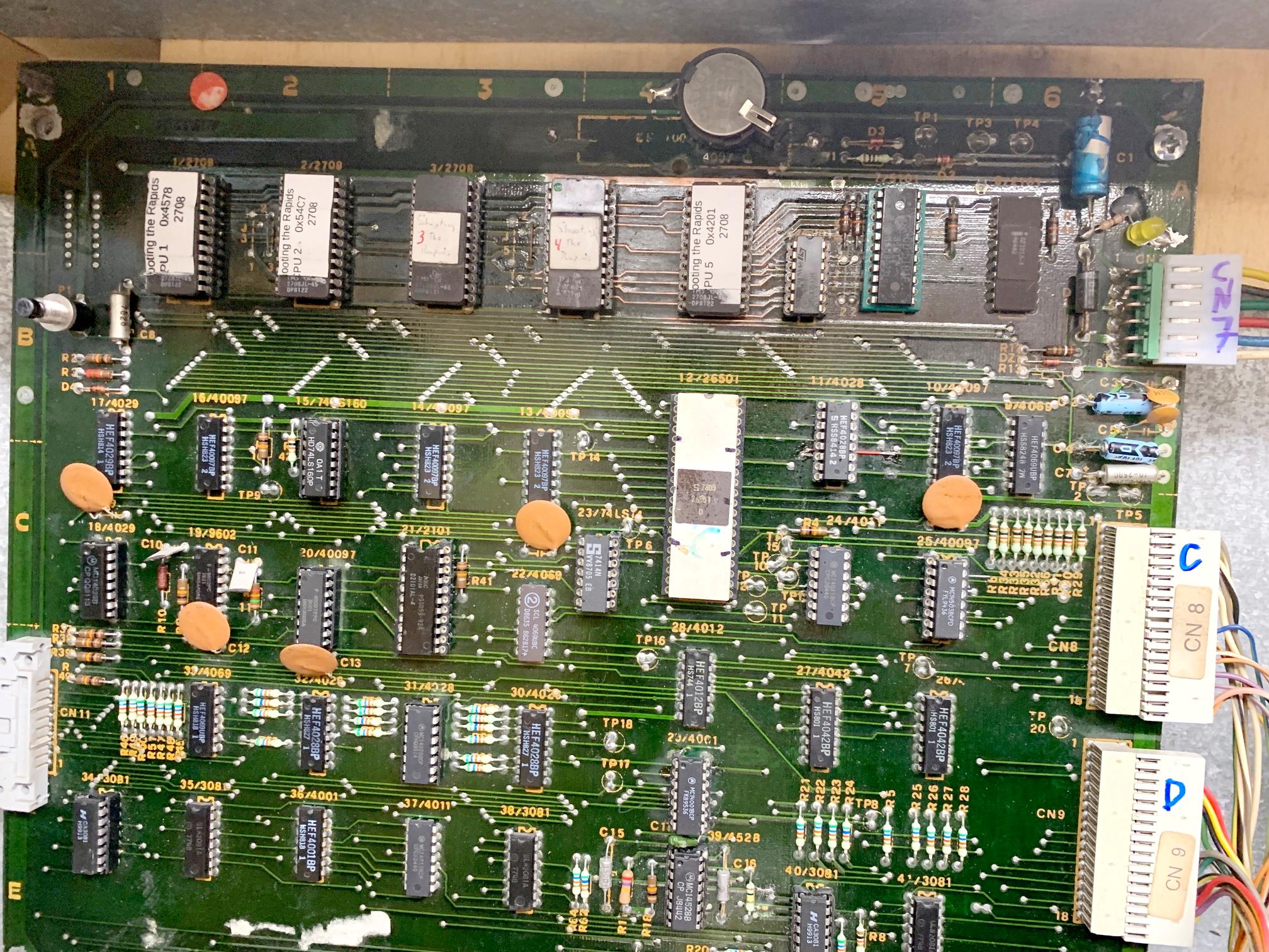Description: 1979 Zaccaria Shoot the Rapids, Zaccaria, 4/79, first Zac with a separate sound board. Also has a beer award light (like Zaccaria Future World) in the backglass (top center). I guess you can win beers, because it really doesn't go with the native American theme. The beer light is a cpu controlled light, you must earn it. Probably then ask the bartender for a free beer... C1B1110/0 MPU board with five 2708 EPROMs, driver board 1B1111/0, power supply 1B1109, six digit display boards 1B1104 or 1B1104/0, sound board (mounted in head insert panel). If you have a Zaccaria pinball for sale please contact me at cfh@provide.net