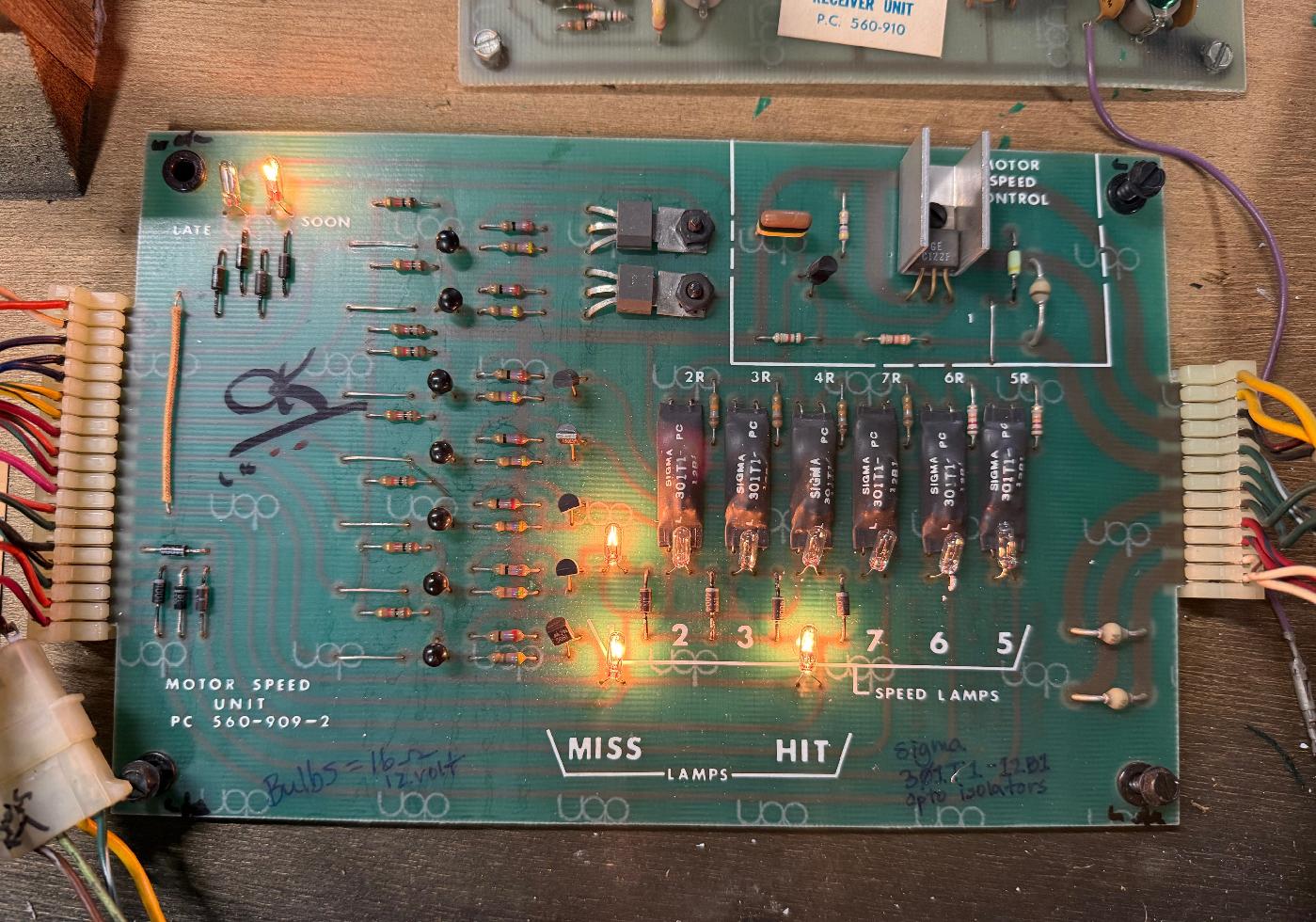 Midway Table Tennis specifics. The motor speed board is very unique, using 2n5061 and c106 SCRs (like Bally -35 pinball games.) But the weird thing used is the Sigma 301T1-12B1 opto isolator. There are six of these, and they work in step with eleven 12 volt T3 style miniature incandescent light bulbs (about 16 ohms each.) Often these builbs either break at the solder point or burn out. If this happens, the game will not play properly. The light bulbs work with the Sigma 301t1-12b1 devices to trigger the SCRs, and varies the motor speed. This changes the ball volley speed in the game. If the board is missing or not working correctly, the game will not play.