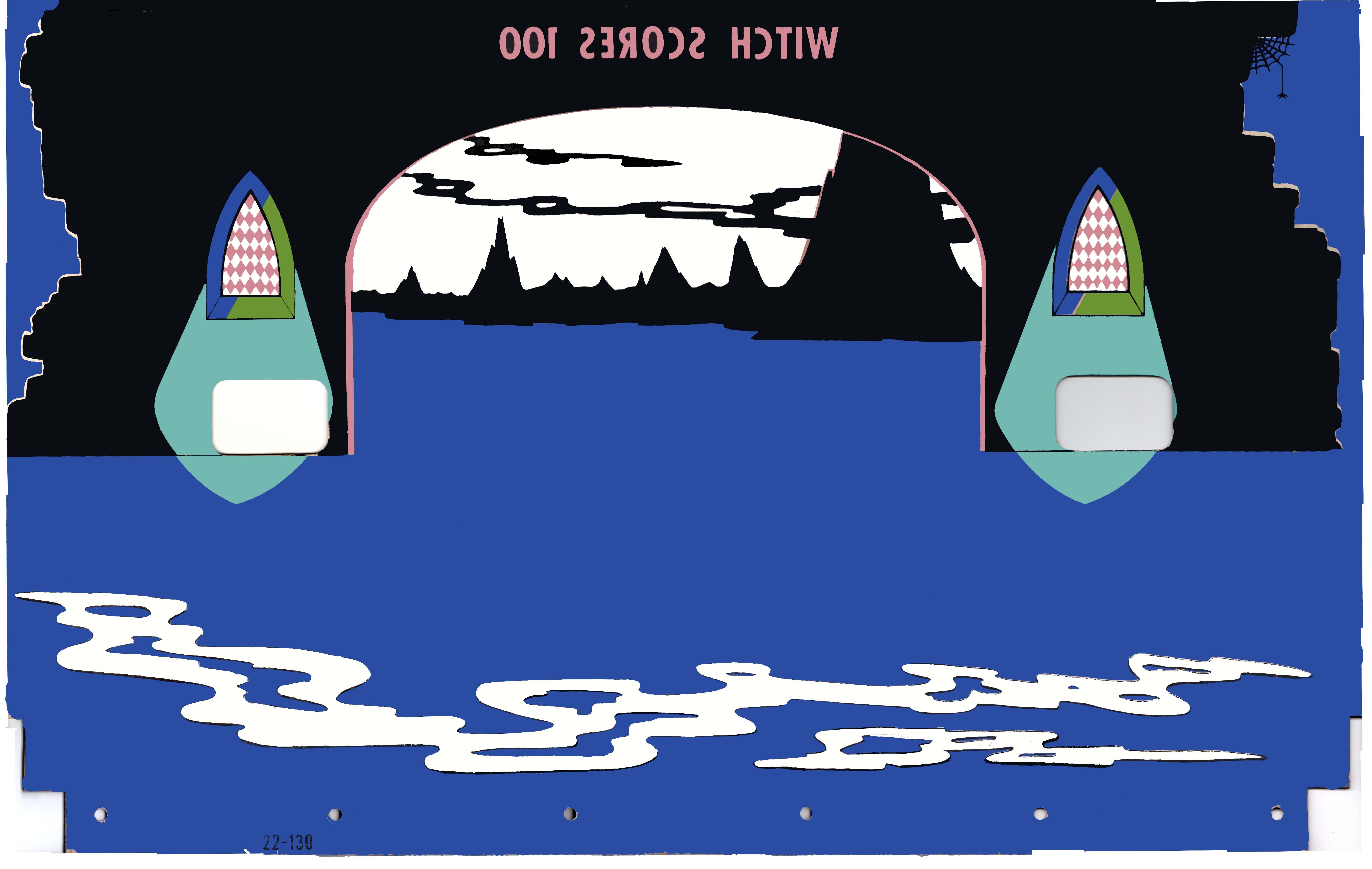This was Williams' first run at using electronic sound in pretty much any game. The sound board makes four different sounds (actually five sounds, but one sound is not used), a sound for each of the three "scenes", plus and extra period sound. The Bullseye Flash makes a low pitch sound, hard to hear. And you only get that one low "beep" with a hit to the Bullseye Flash. After that hit the scene changes, and the Skull target appears. The Skull has a medium pitched sound with a hit (a curtain hides the skull target until it is activated in the game.) The Skull will rise and fall, giving the player plenty of time for many hits. Once the Skull falls, the Witch scene starts with witch movement across the top of the backdrop. You have one chance to hit the Witch - if you miss, the Witch scene is over, and it moves to the beginning (Bullseye Flash or end of game.) But hit the Witch and she reverses direction. The object is to keep hitting her, making her go back and forth in quick progression. This will go on forever or until you miss! The sound for the Witch is a higher pitch "beep." Basically the sound board is making the same sound for the three scenes, but at three different pitches. If you get past the replay score, you get an additional period of the three scenes, and the game makes five quick sounds in sequence to signify an extra period.